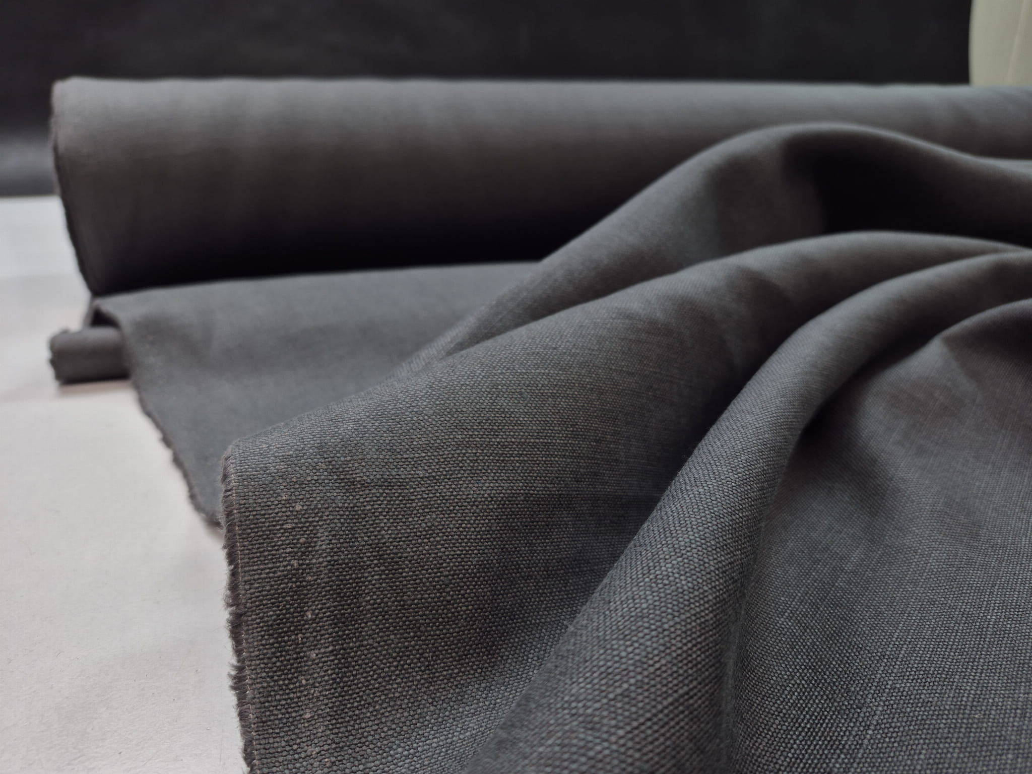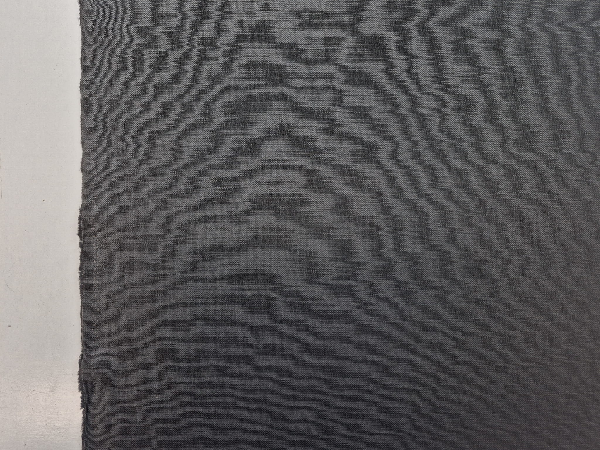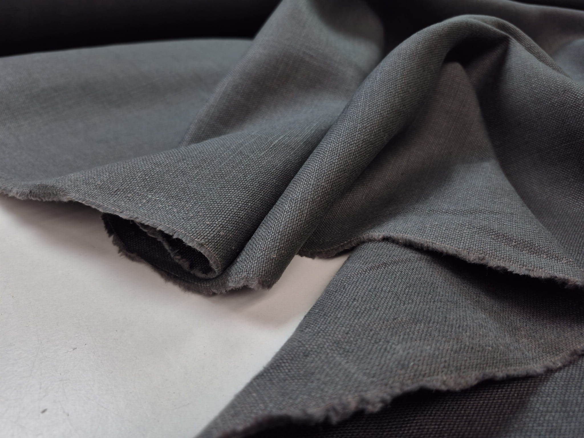 100% len w ciemnoszarym kolorze. Średnio gruby, miękki i lejący się zwłaszcza jak na jego gramaturę. Zbity, bardzo gęsto utkany. Splot prosty, płócienny, typowy dla lnu. Naturalny materiał o eleganckim wyglądzie doskonale się układa. Przykładowe zastosowanie: