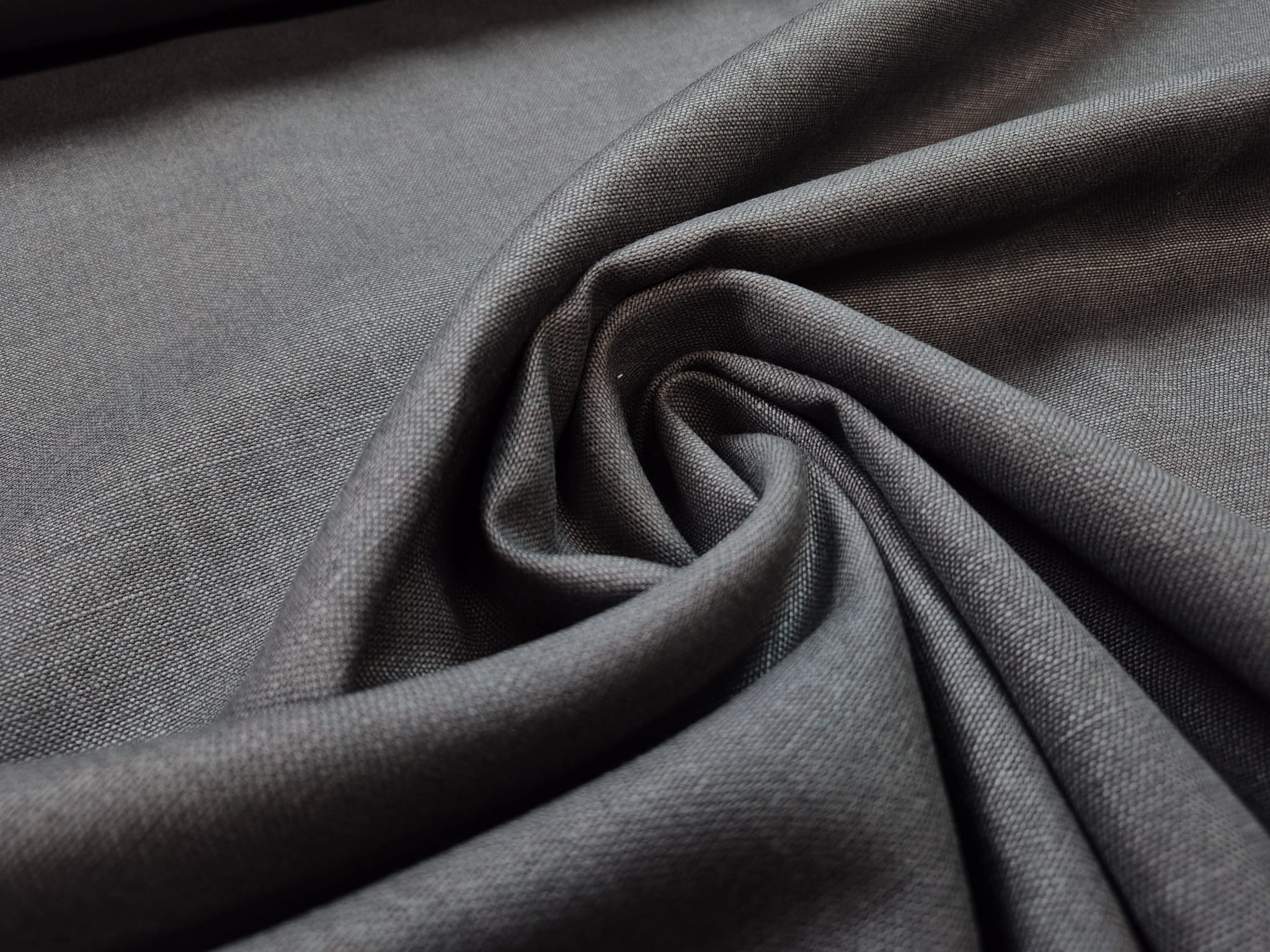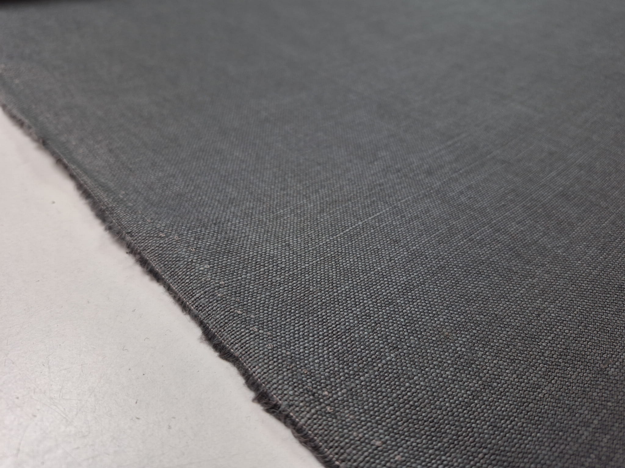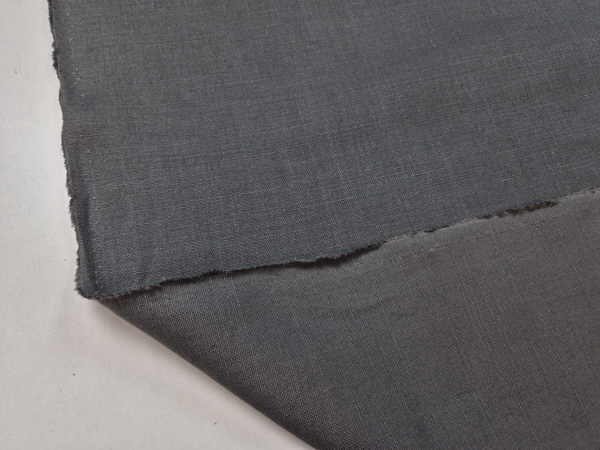 100% len w ciemnoszarym kolorze. Średnio gruby, miękki i lejący się zwłaszcza jak na jego gramaturę. Zbity, bardzo gęsto utkany. Splot prosty, płócienny, typowy dla lnu. Naturalny materiał o eleganckim wyglądzie doskonale się układa. Przykładowe zastosowanie: