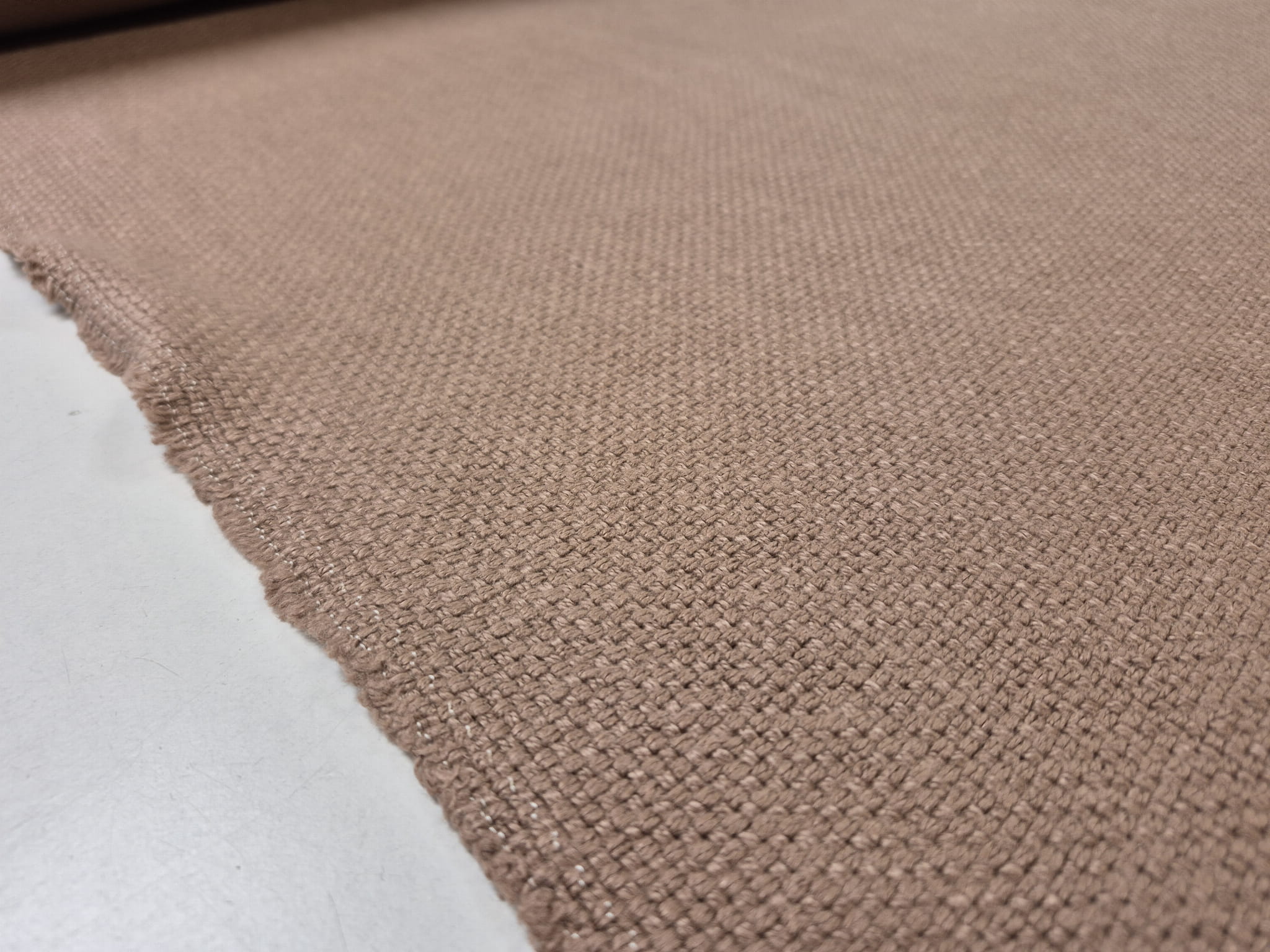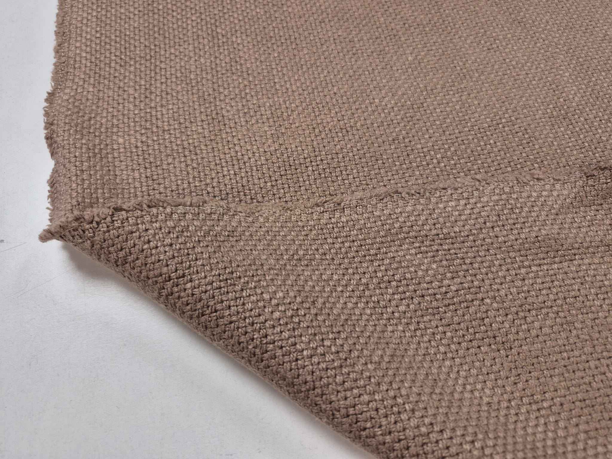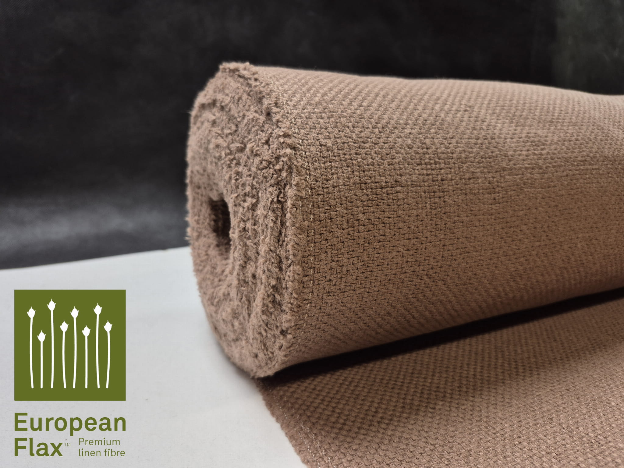 100% len obiciowy w kolorze clay (glina, lekko sprany). Len jest gruby, ciężki i gęsto utkany, z widocznym splotem. Jednocześnie dzięki wykończeniu "Stonewash" jest również miękki i przyjemny w dotyku. Dekatyzowany, dzięki czemu materiał nie skurczy się w praniu. Len posiada certyfikat European Flax Certyficate. Przykładowe zastosowanie: