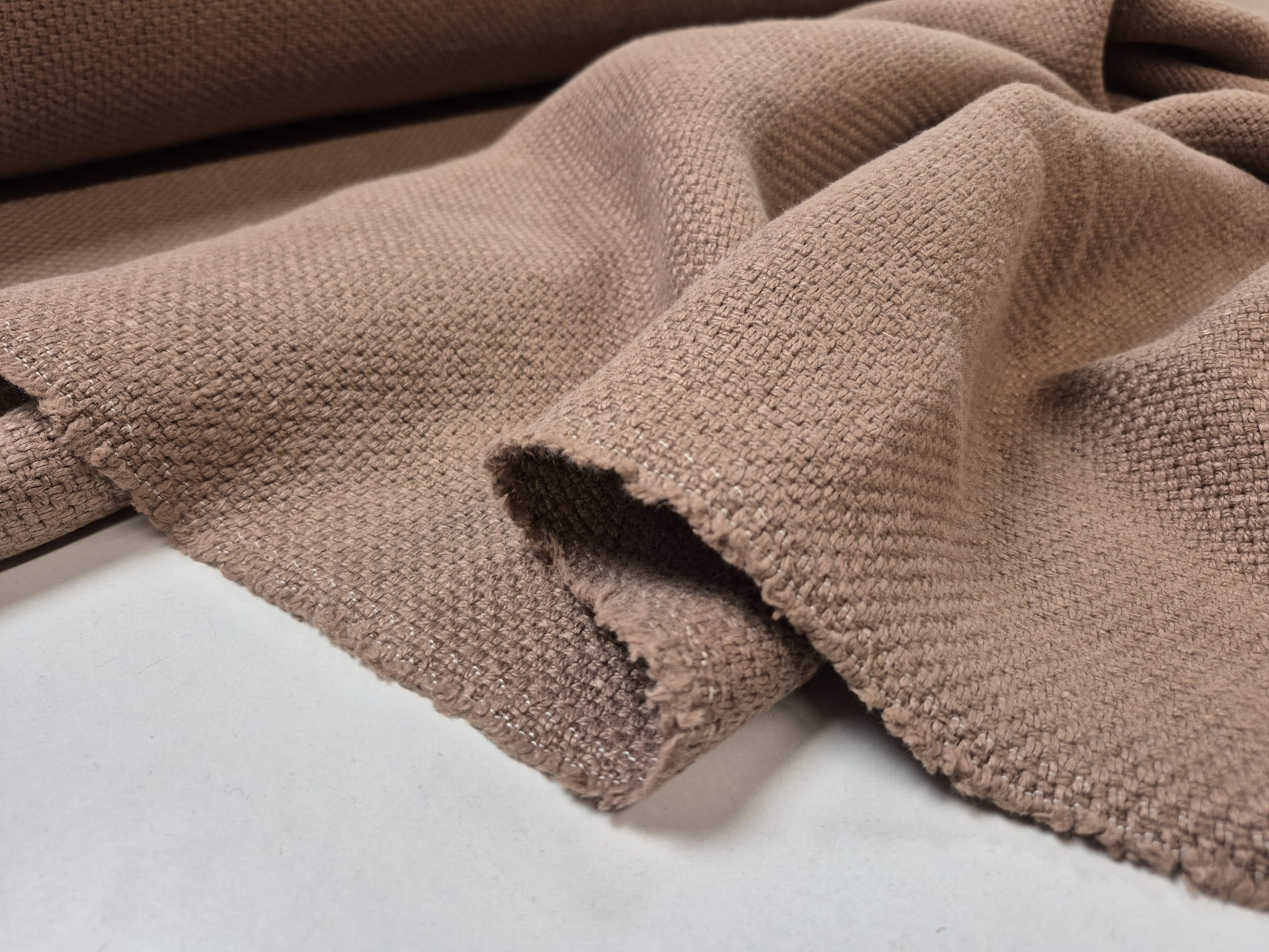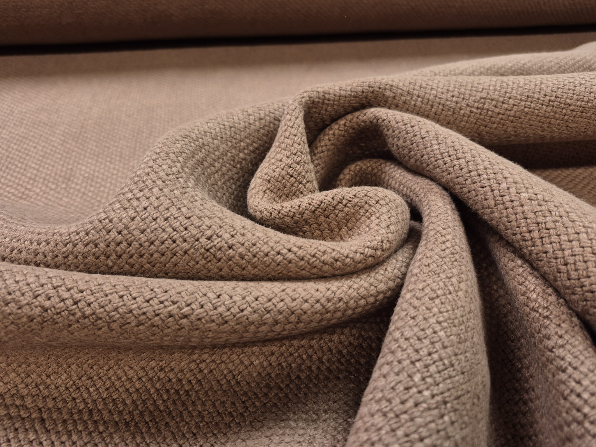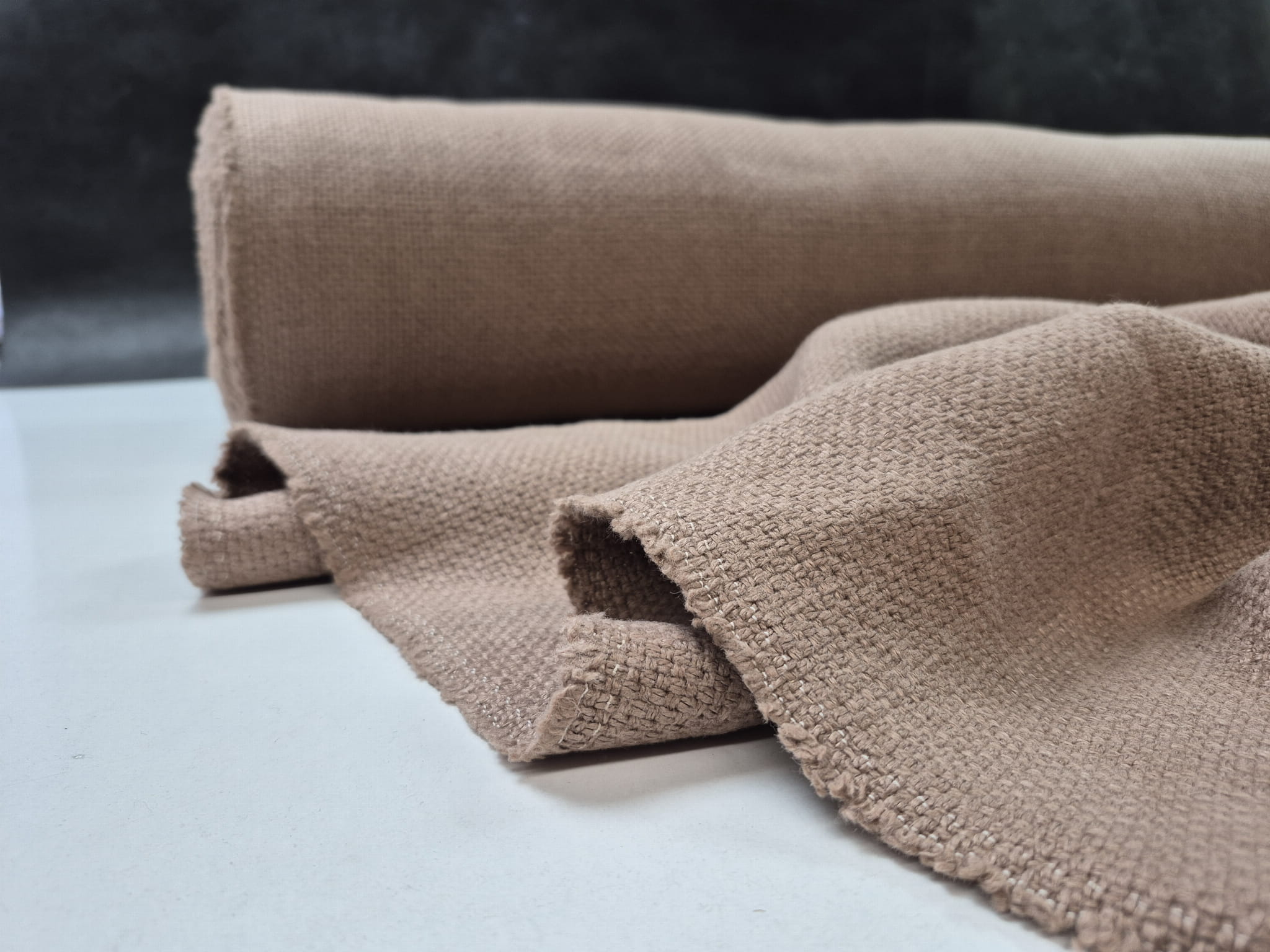 100% len obiciowy w kolorze clay (glina, lekko sprany). Len jest gruby, ciężki i gęsto utkany, z widocznym splotem. Jednocześnie dzięki wykończeniu "Stonewash" jest również miękki i przyjemny w dotyku. Dekatyzowany, dzięki czemu materiał nie skurczy się w praniu. Len posiada certyfikat European Flax Certyficate. Przykładowe zastosowanie: