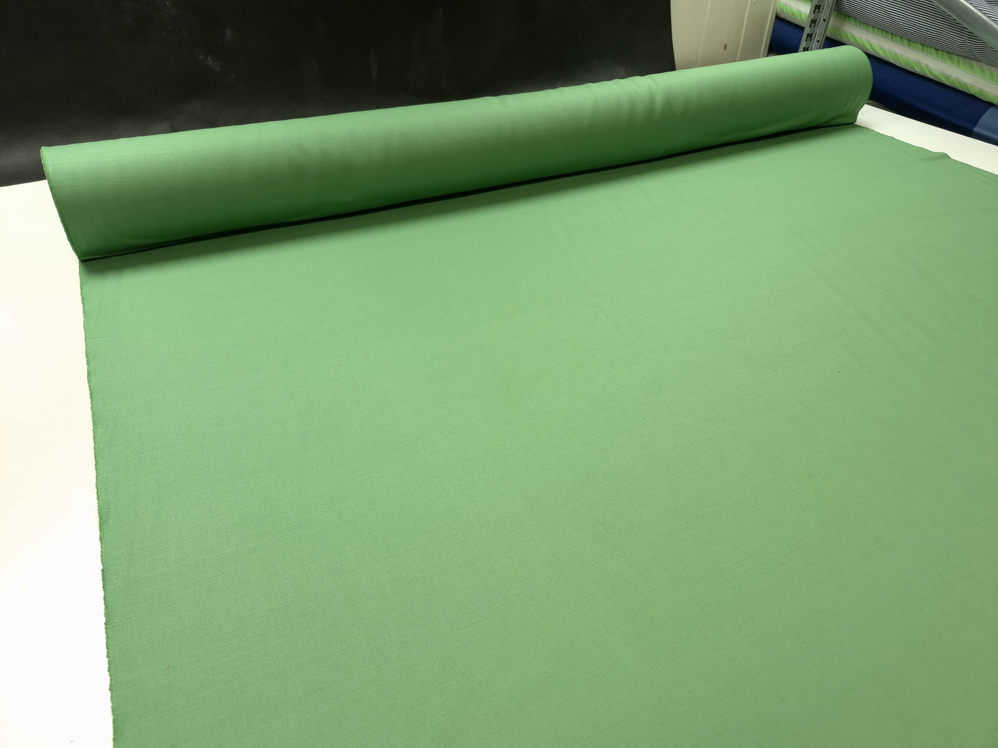Len Easy Care w kolorze zielonym (bazylia. Dokładny skład to 52% len 48% bawełna. Wykończenie "Easy Care", dzięki czemu len mniej się gniecie, zapamiętuje swój kształt, mniej deformuje się przy praniu i łatwiej się go prasuje. Cienki, ale nie prześwitujący, lekko sztywny. Tej pozycji jest hurtowa ilość - ponad 500 mb, może być na większą produkcję. Len posiada certyfikat European Flax Certyficate.