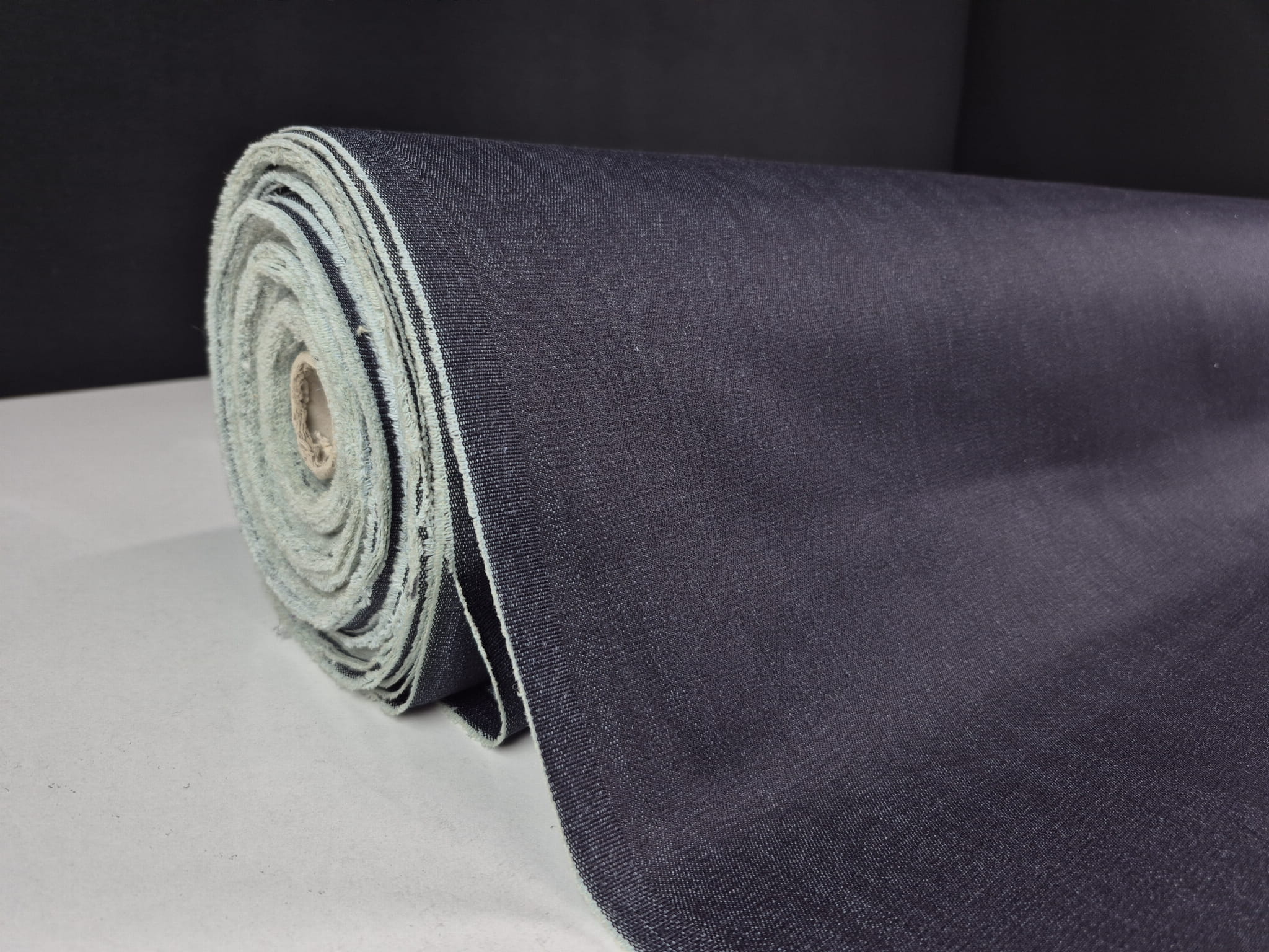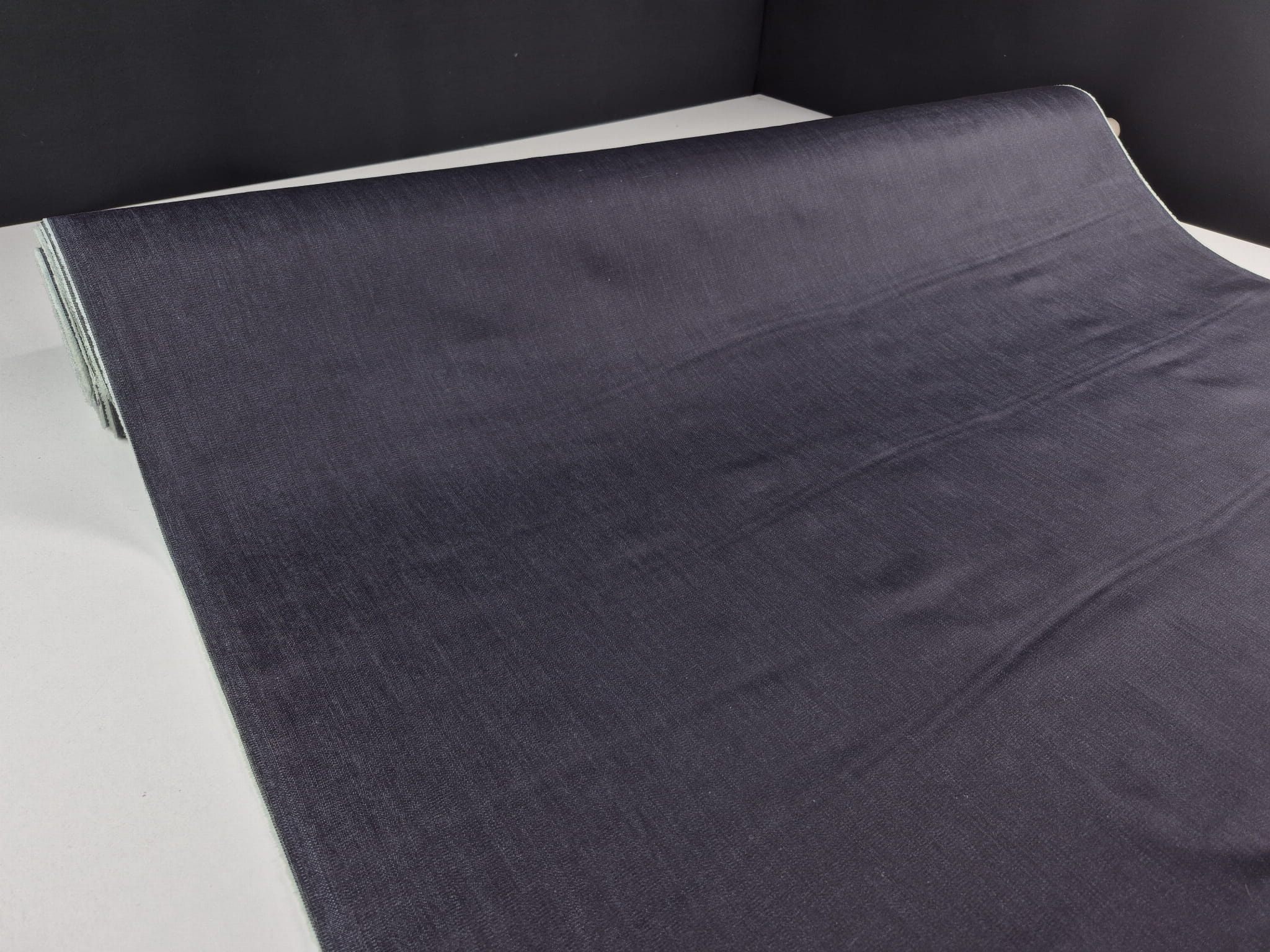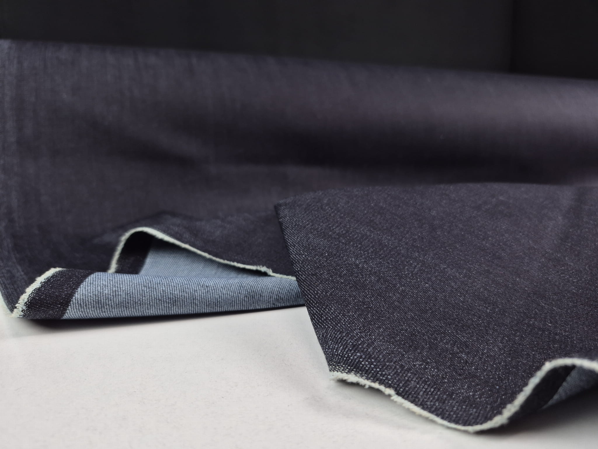 Tkanina jeans (dżins) o dokładnym składzie 97% bawełna 3% elastan. Jest bardzo mocna i wytrzymała, splot diagonalny (skośny). W przypadku tego jeansu czuć dodatek elastanu, tkanina mocno uciąga się po szerokości, jest stosunkowo lejąca, średnio gruba. Piękny, głęboki kolor bardzo ciemny denim z delikatnym połyskiem pod światło. Przykładowe zastosowanie: