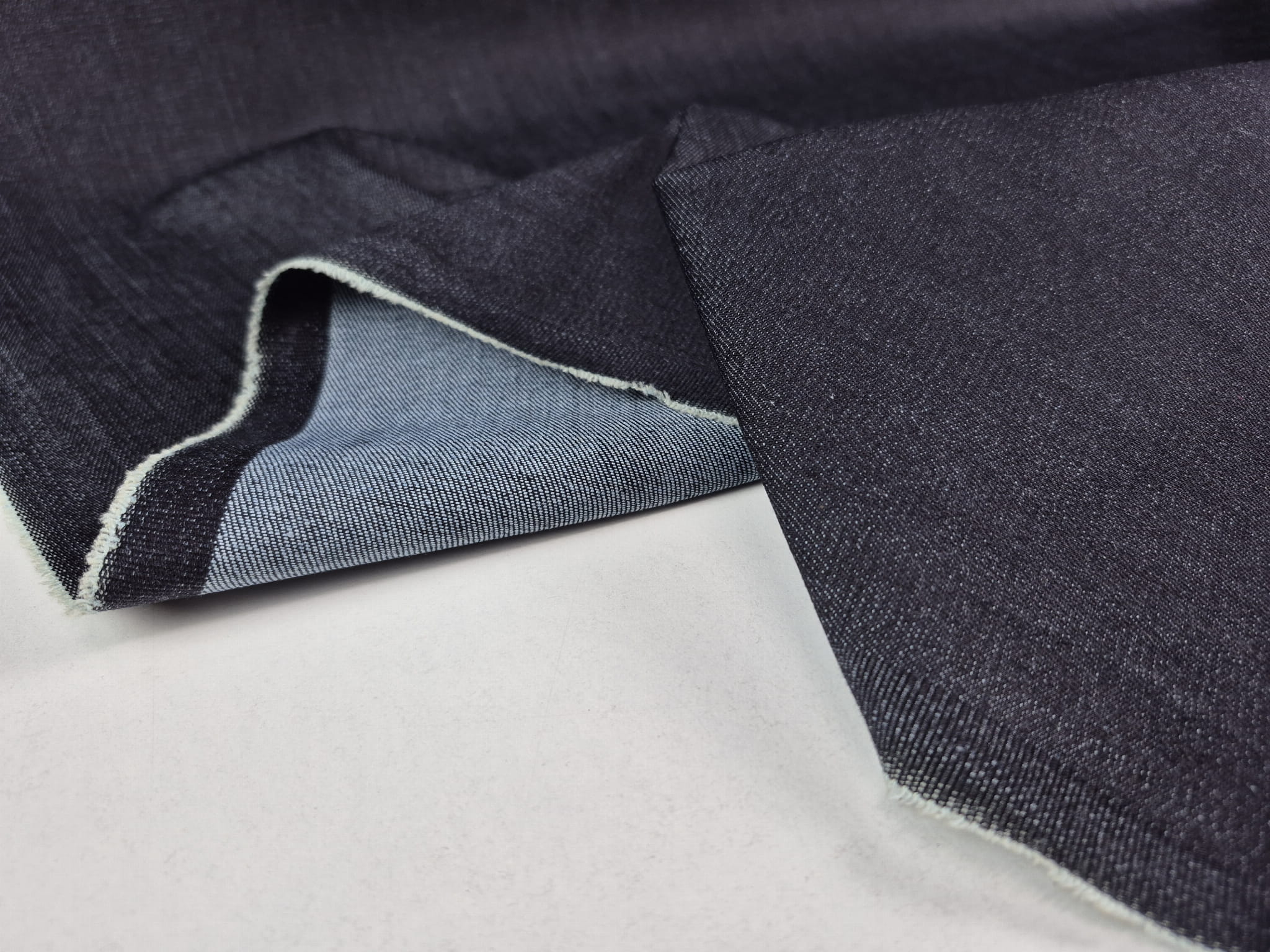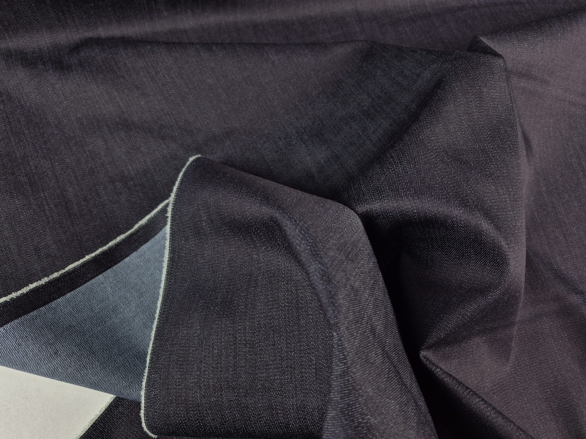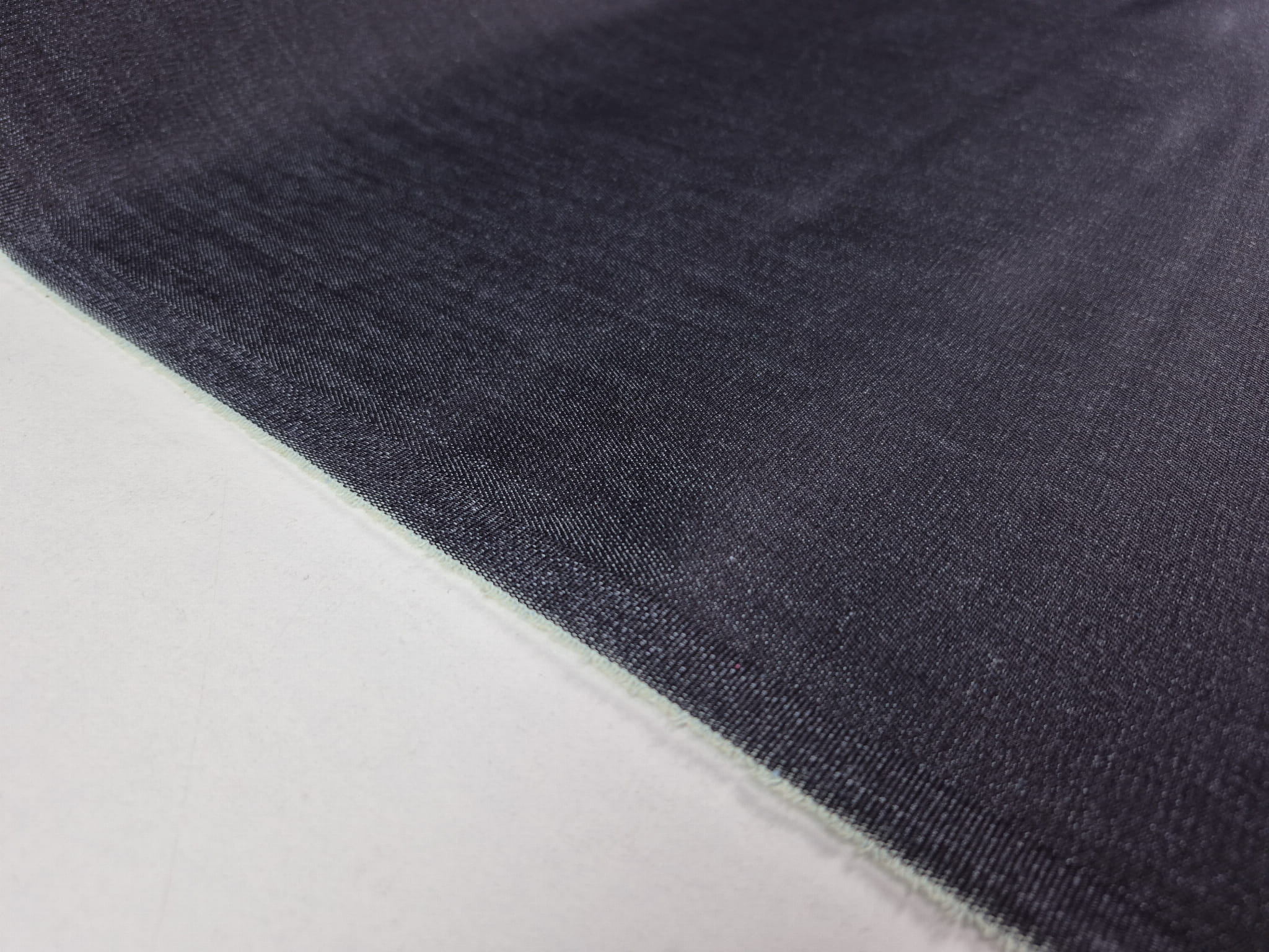 Tkanina jeans (dżins) o dokładnym składzie 97% bawełna 3% elastan. Jest bardzo mocna i wytrzymała, splot diagonalny (skośny). W przypadku tego jeansu czuć dodatek elastanu, tkanina mocno uciąga się po szerokości, jest stosunkowo lejąca, średnio gruba. Piękny, głęboki kolor bardzo ciemny denim z delikatnym połyskiem pod światło. Przykładowe zastosowanie: