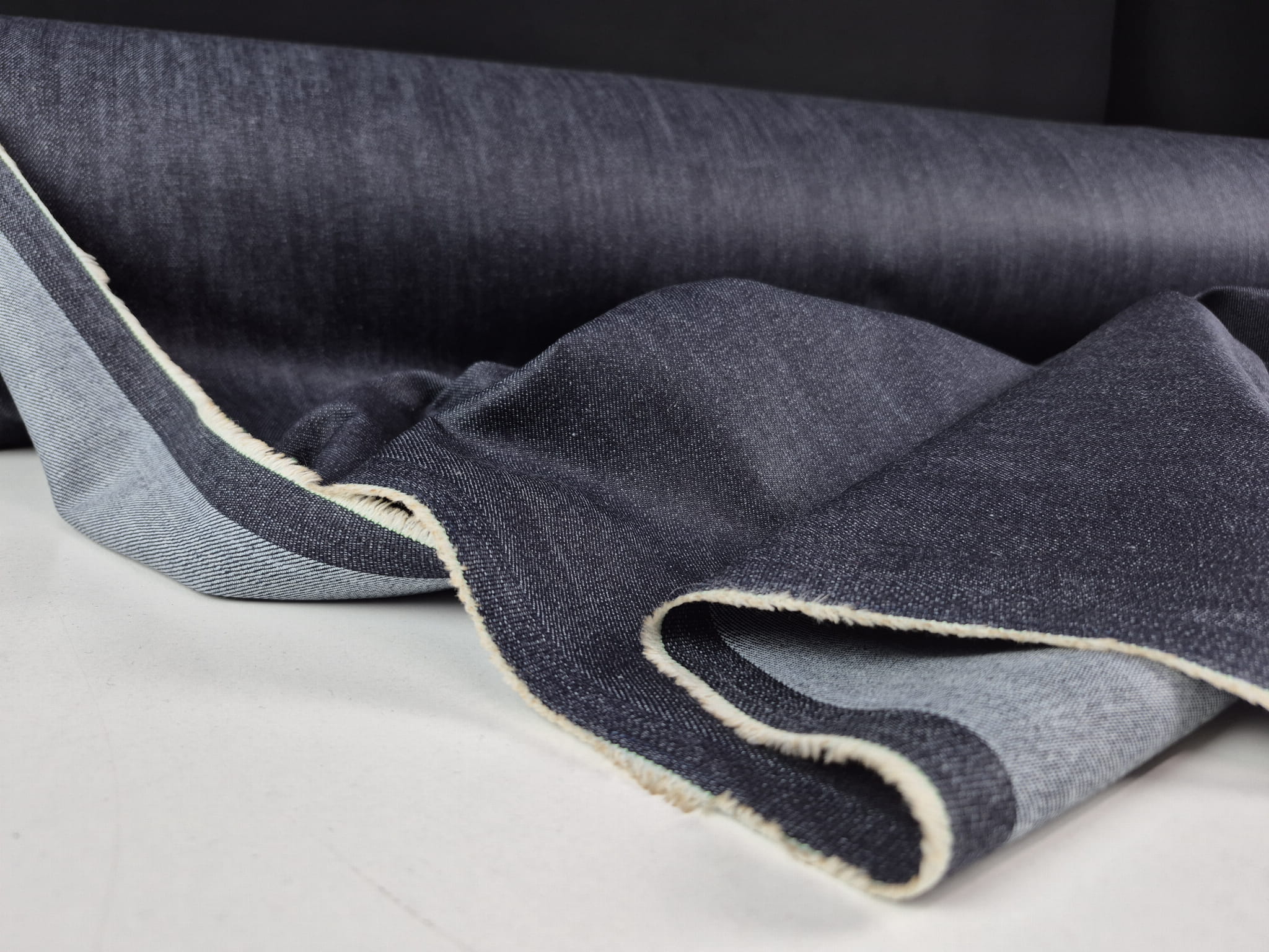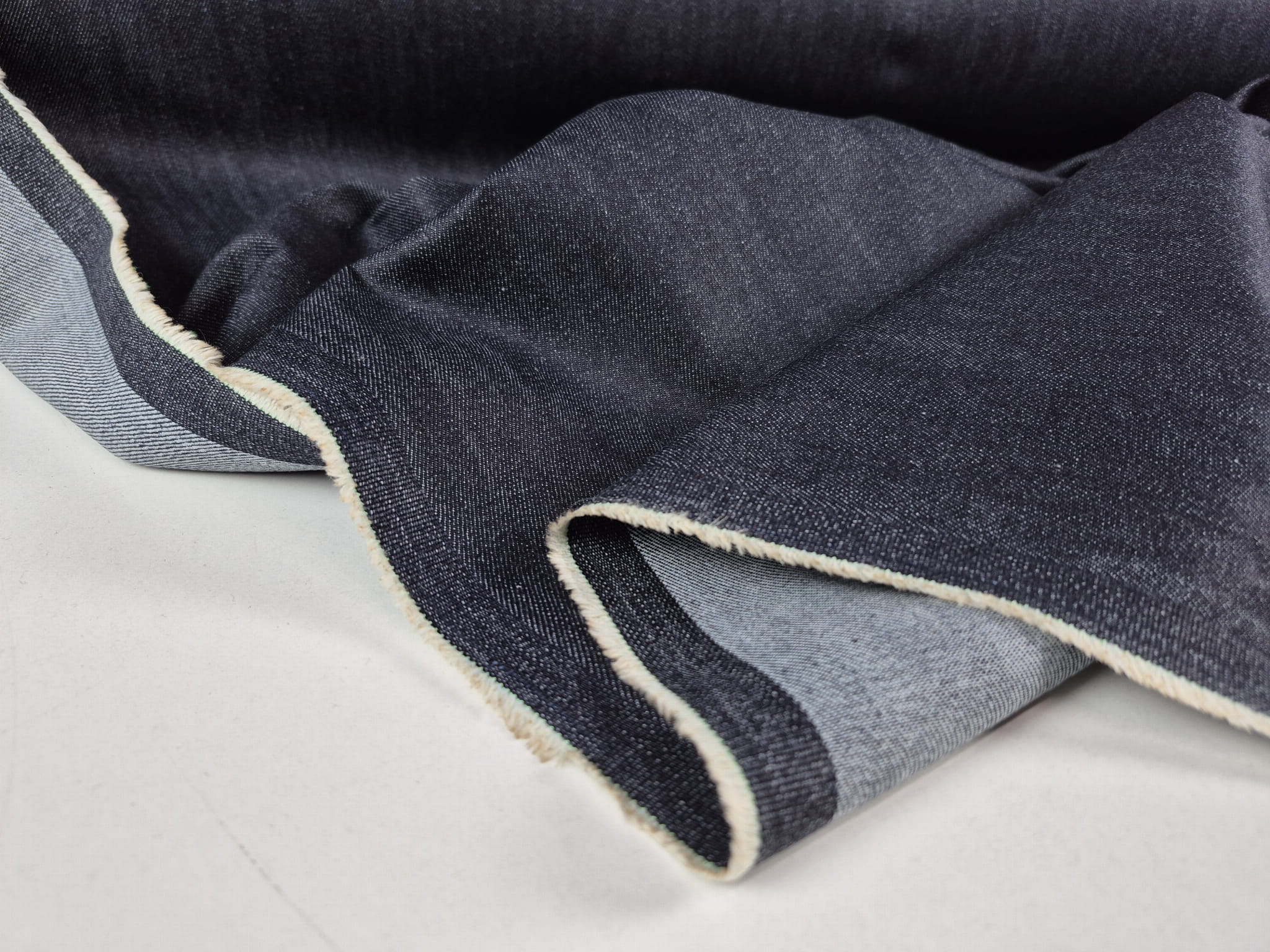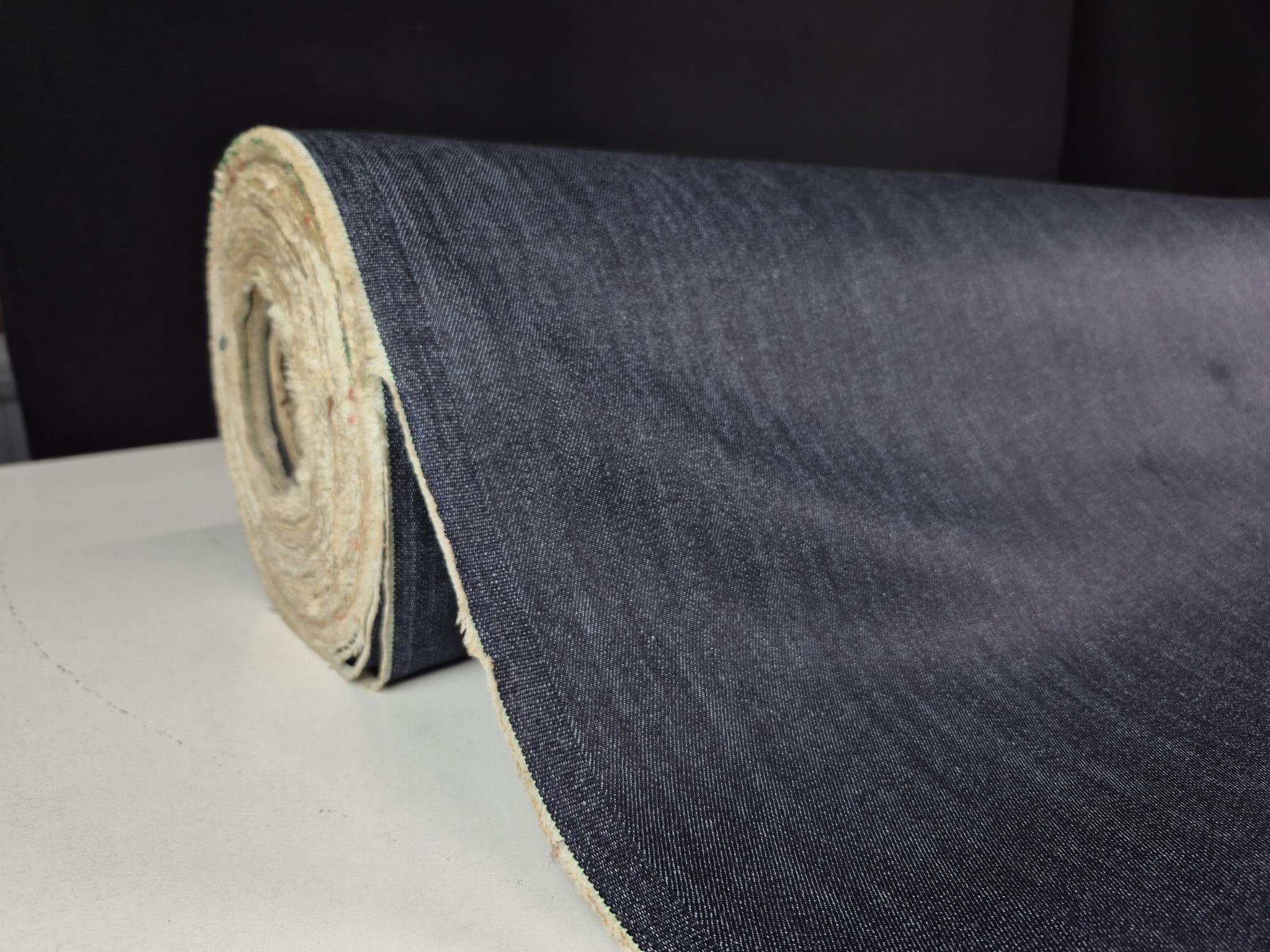 Tkanina jeans (dżins) o dokładnym składzie 84% bawełna 14% poliamid 2% elastan. Jest bardzo mocna i wytrzymała, splot diagonalny (skośny). W przypadku tego jeansu czuć dodatek elastanu, tkanina mocno uciąga się po szerokości, jest stosunkowo lejąca, średnio gruba. Piękny, głęboki kolor ciemny denim z delikatnym połyskiem pod światło. Przykładowe zastosowanie: