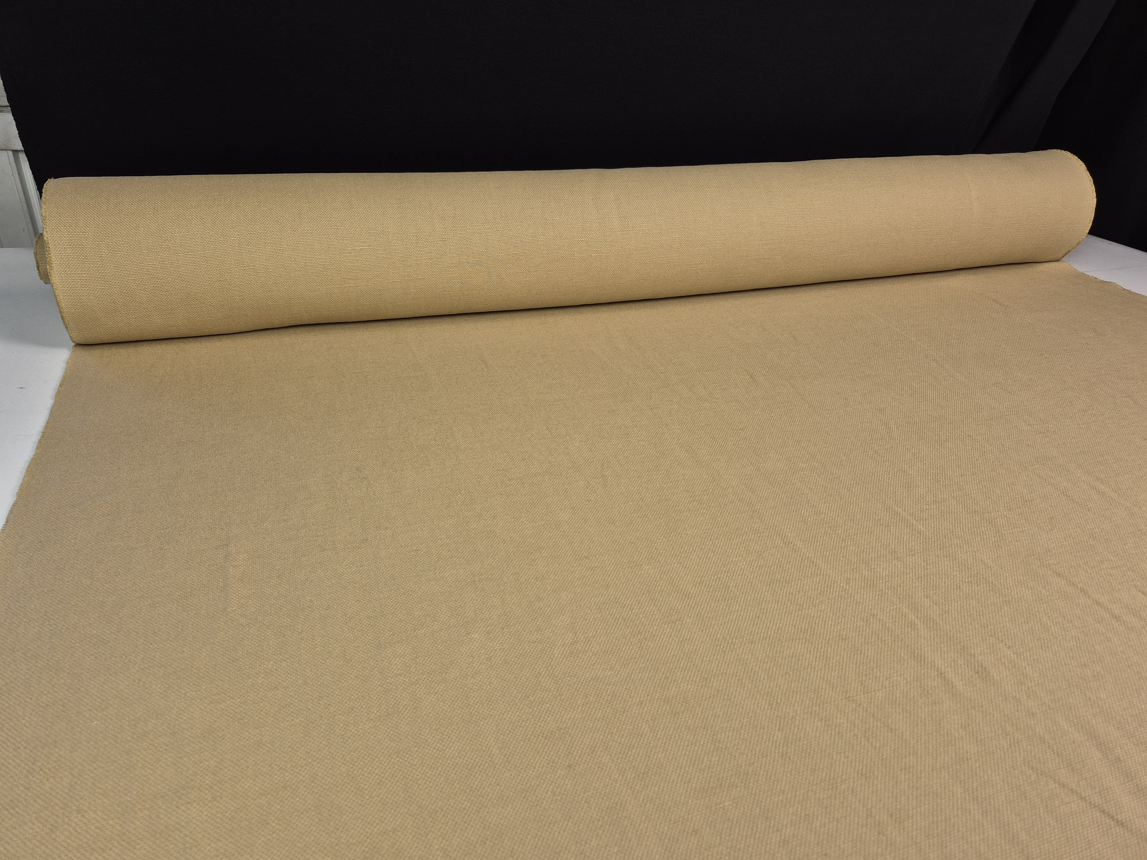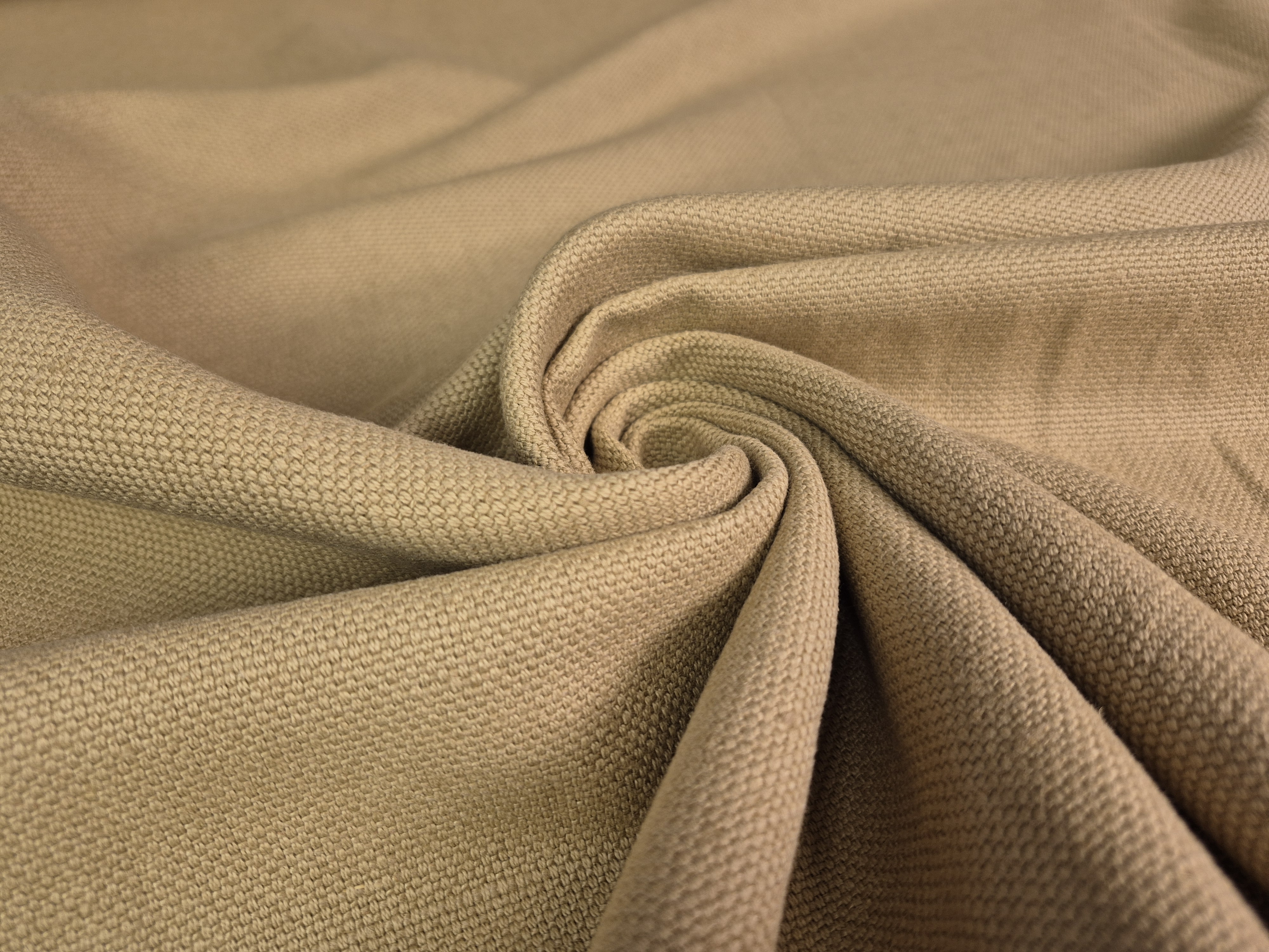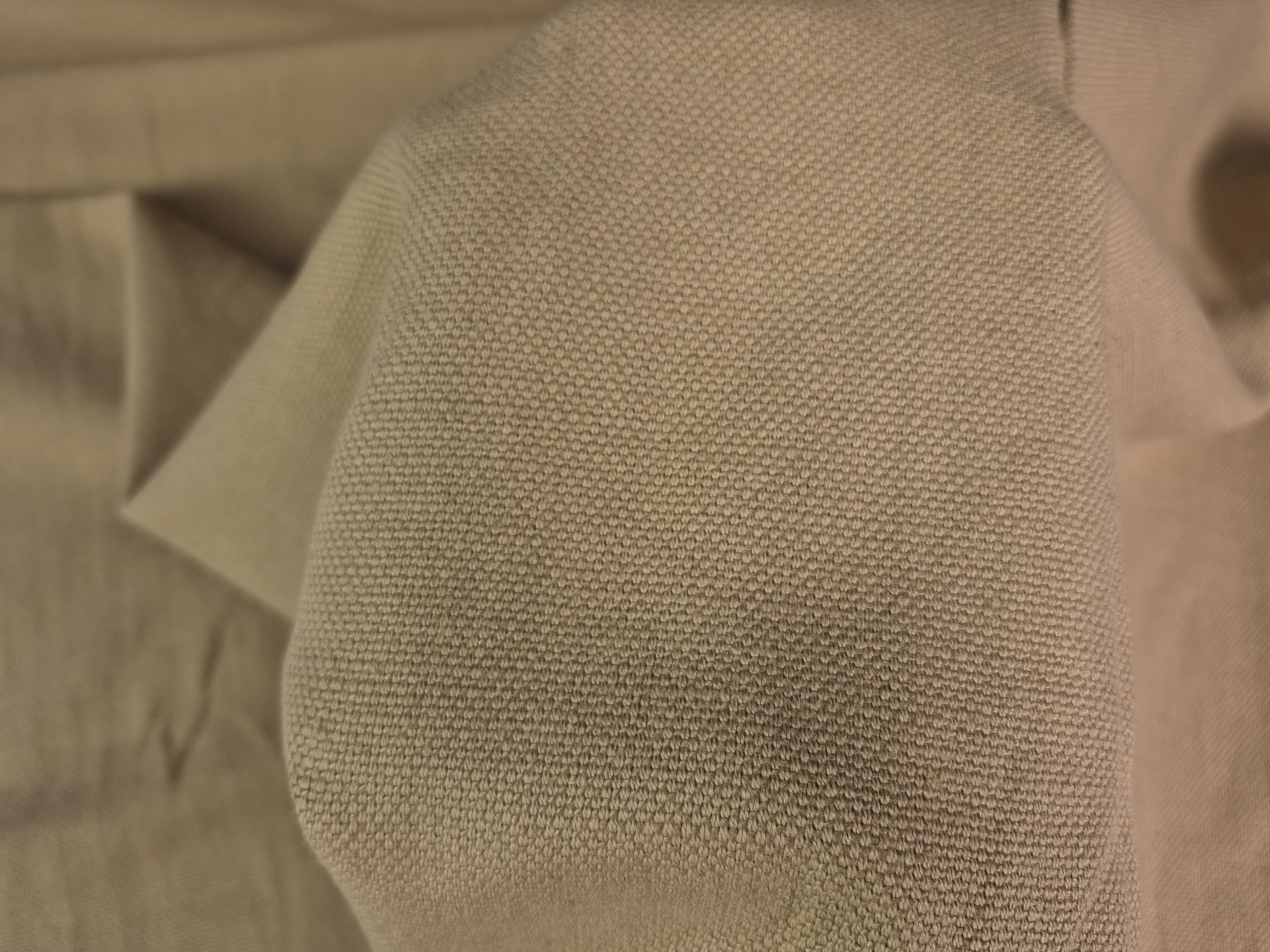 Len o widocznych, płócienny splocie. Zmiękczany i dekatyzowany - jak na swoją gramaturę całkiem lejący. Kolor zdecydowanie stonowany.