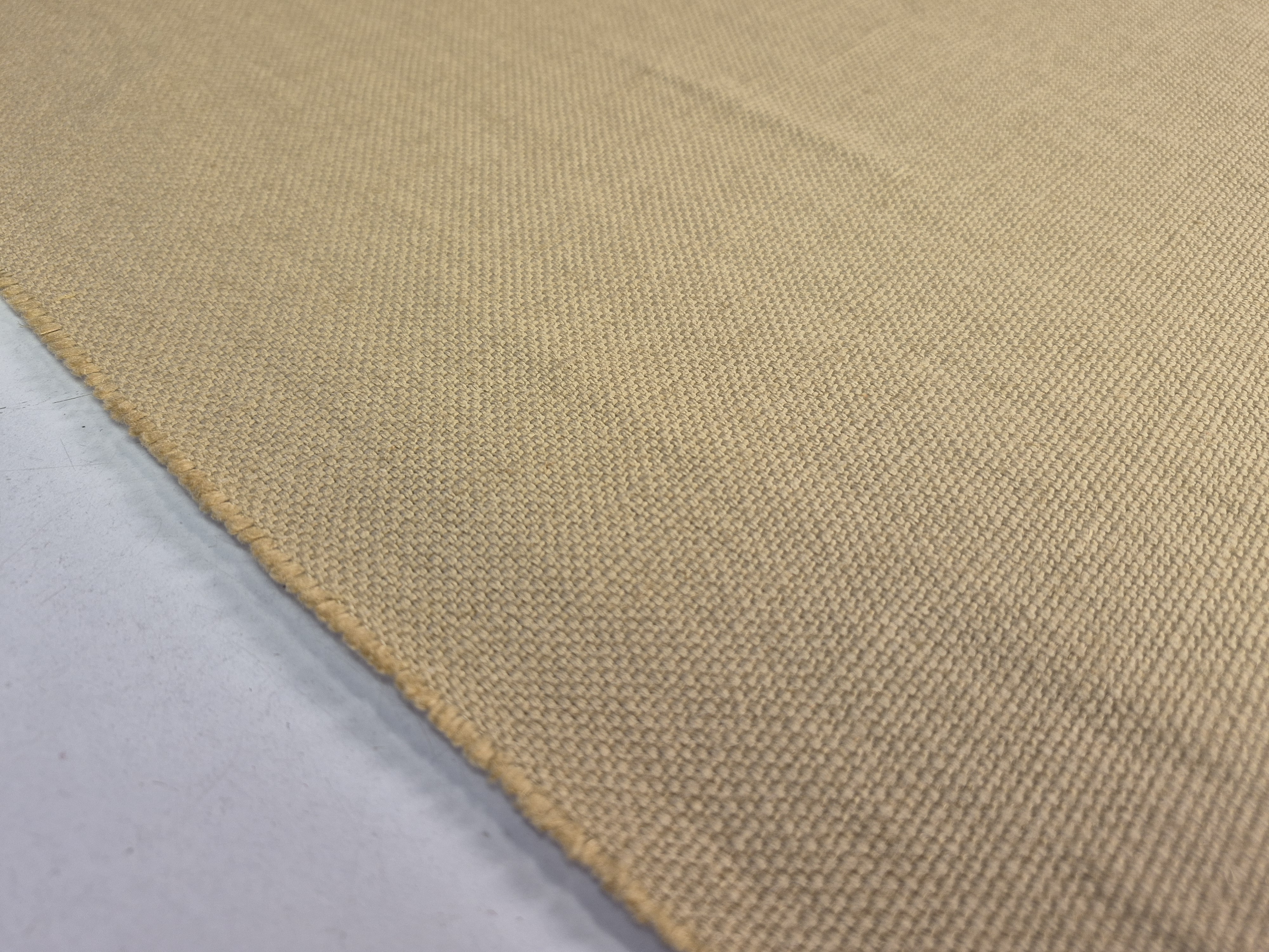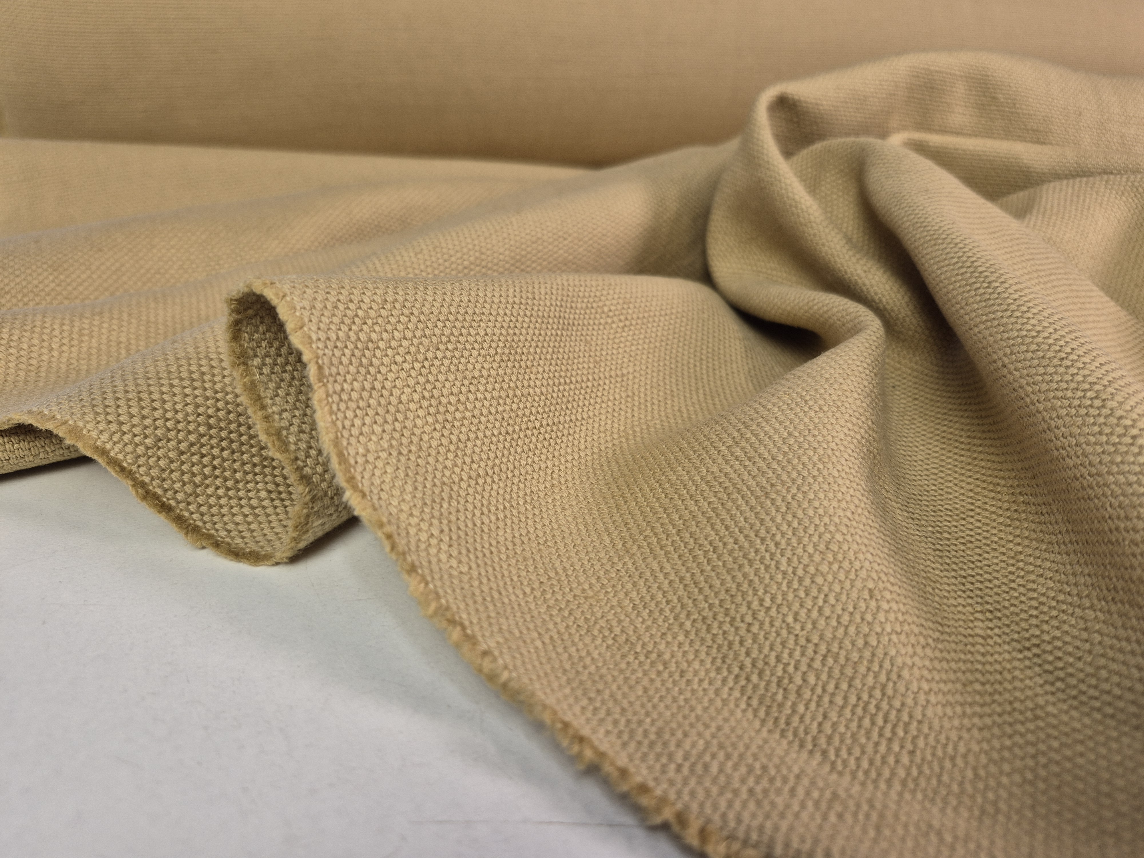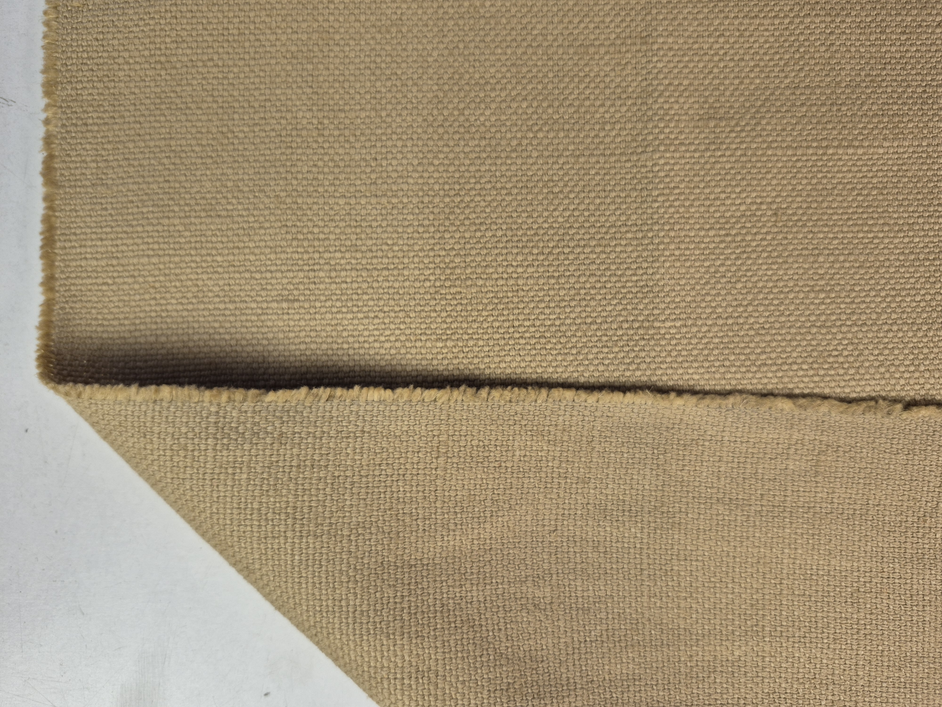 Len o widocznych, płócienny splocie. Zmiękczany i dekatyzowany - jak na swoją gramaturę całkiem lejący. Kolor zdecydowanie stonowany.