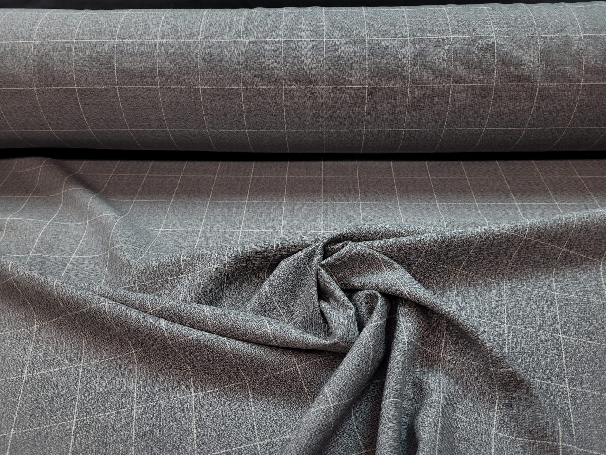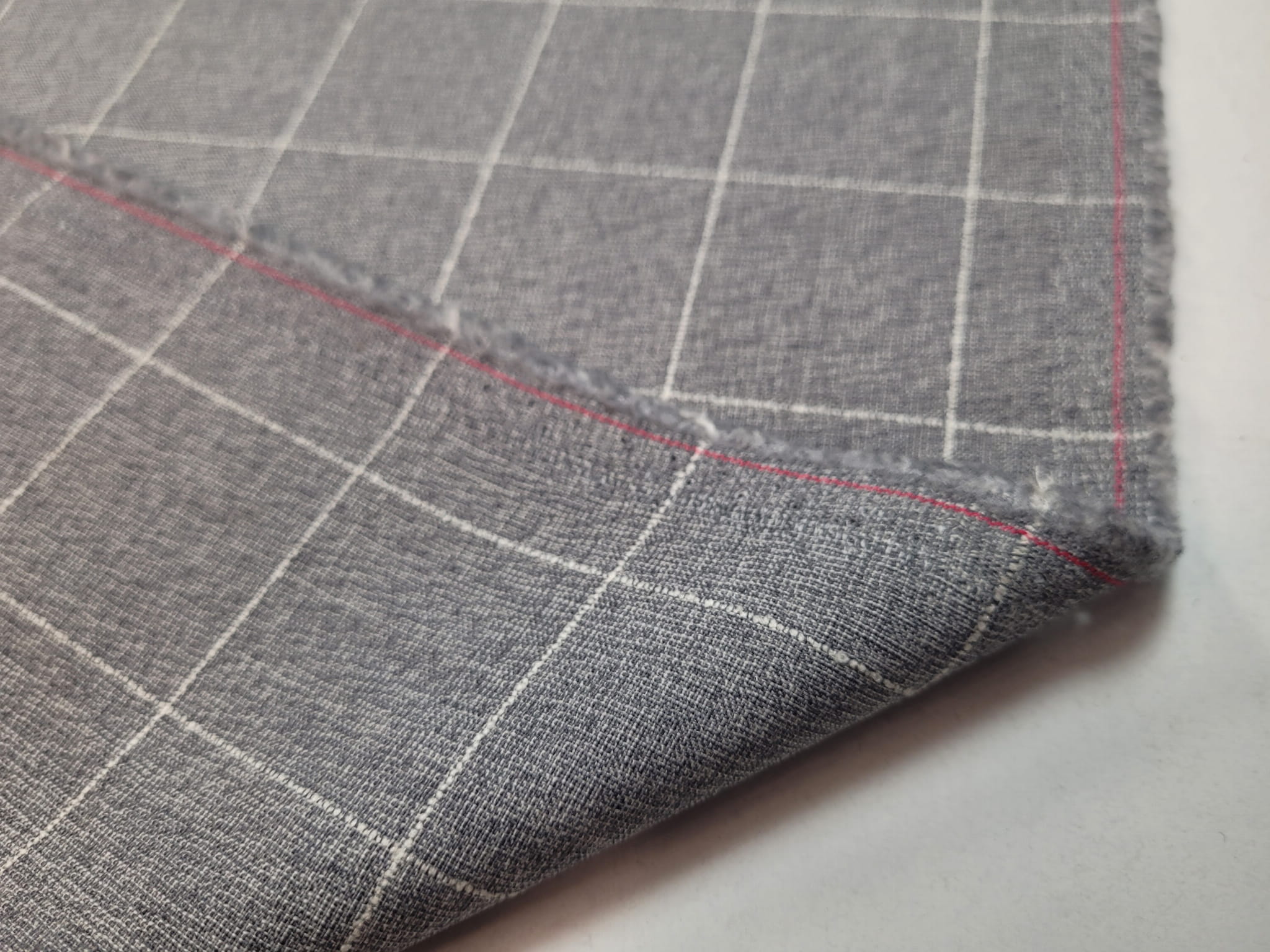 100% virgin wool włoskiej produkcji nazwany oryginalnie "Marlane". Jest to typowy materiał garniturowy w szaro-białą kratkę. Lekko szorstki, delikatnie pracujący po szerokości. W dotyku czuć lekko wystające białe linie kraty, typu 3D.