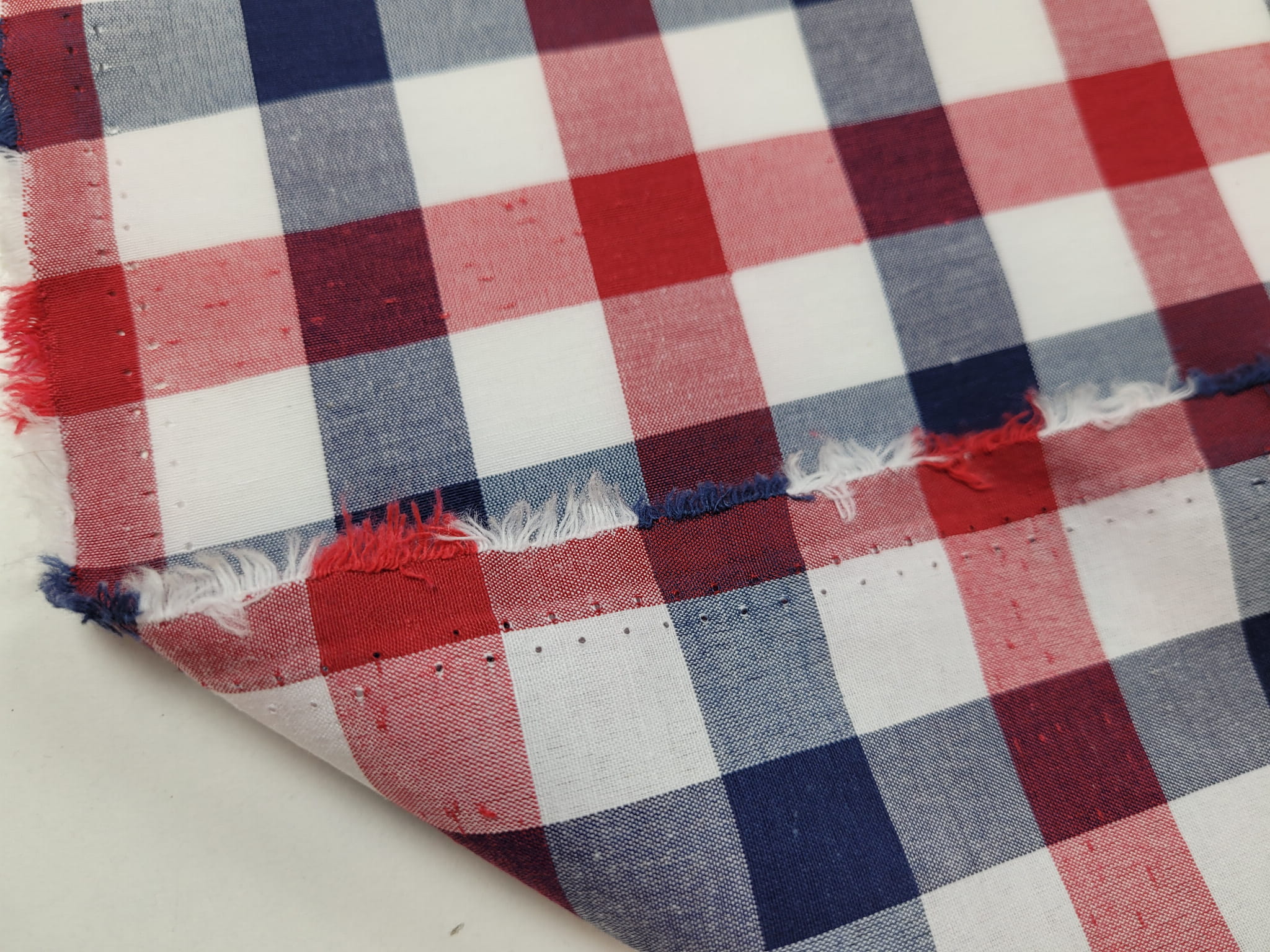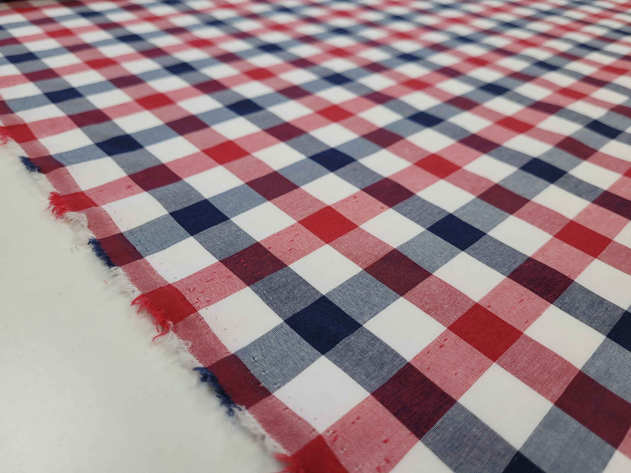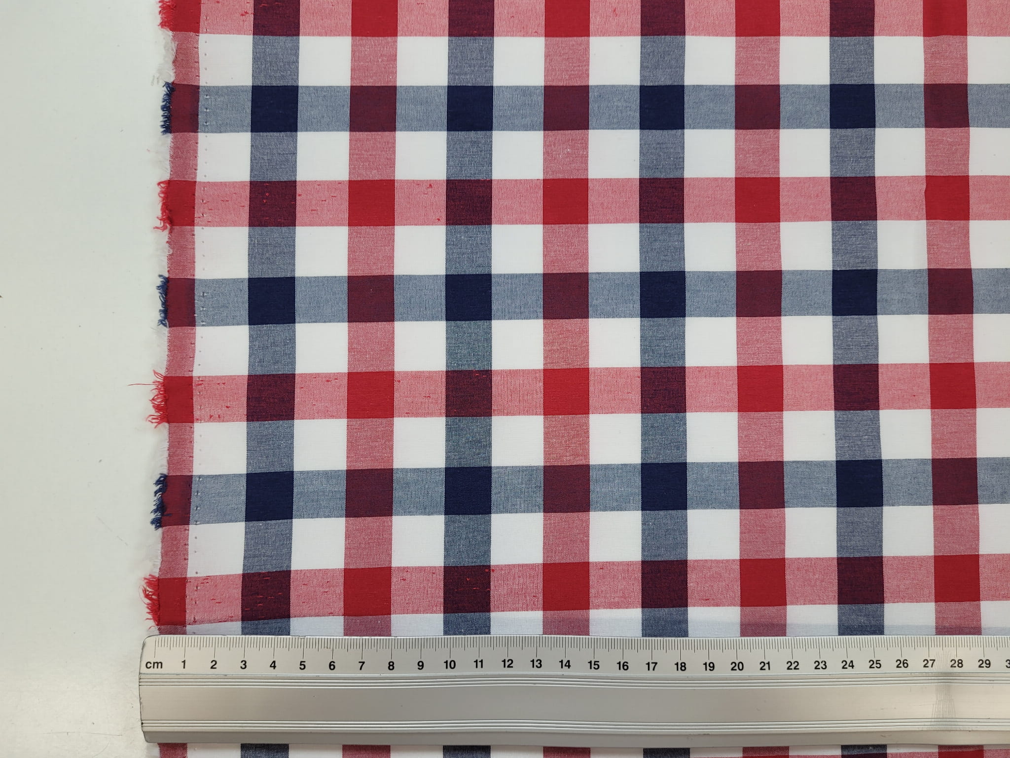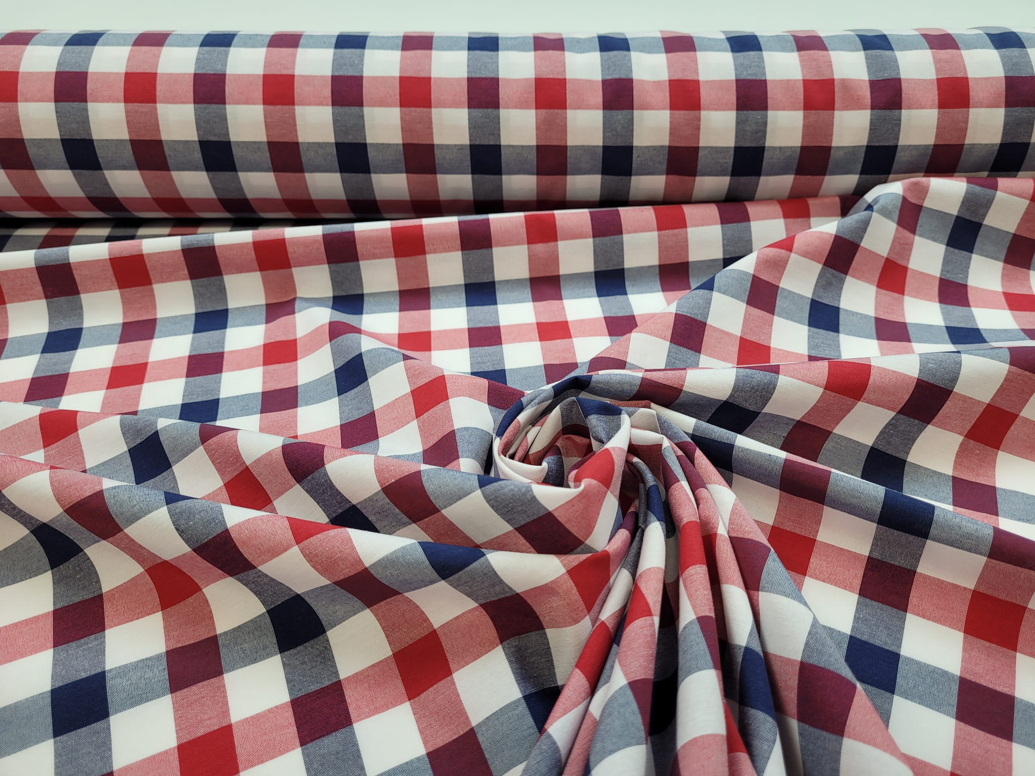 Bawełna koszulowa we wzór kraty typu vichy. Skład 65% bawełna 35% poliester. Kratka jest w kolorze biało-czerwono-granatowym. Przyjemna w dotyku, lekko pracuje po szerokości, mało się gniecie.