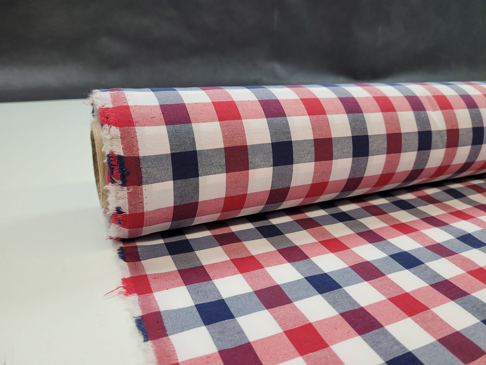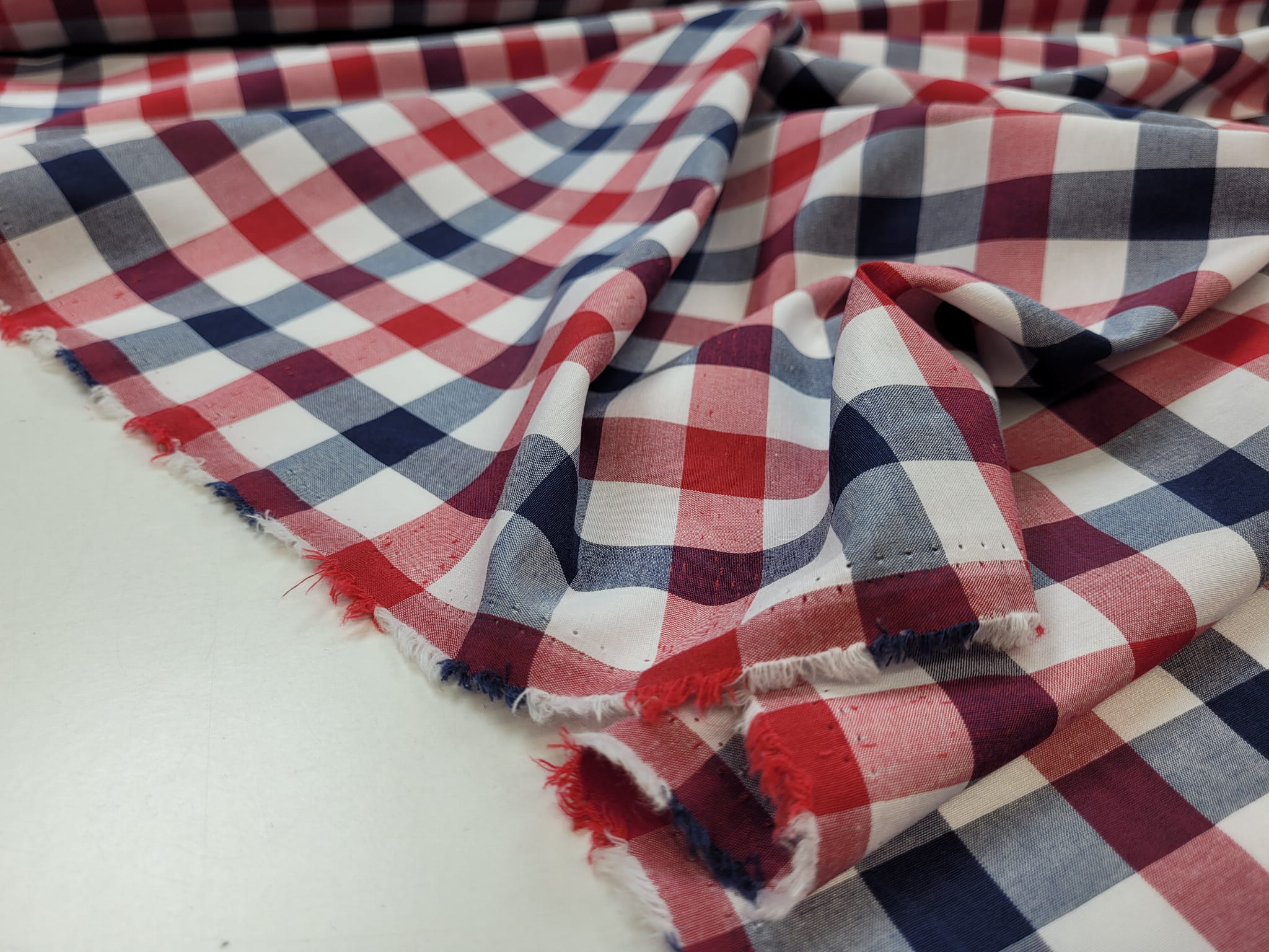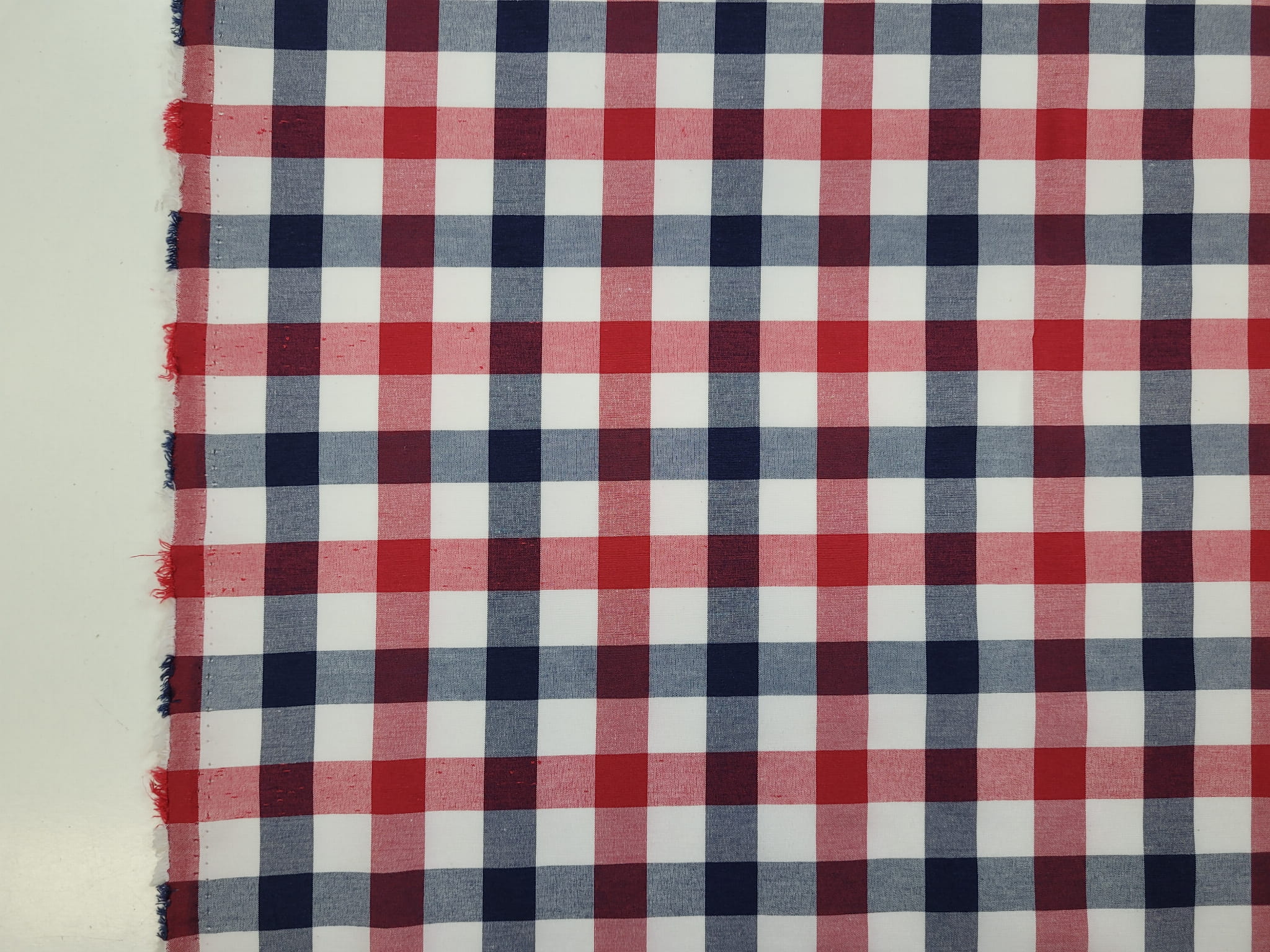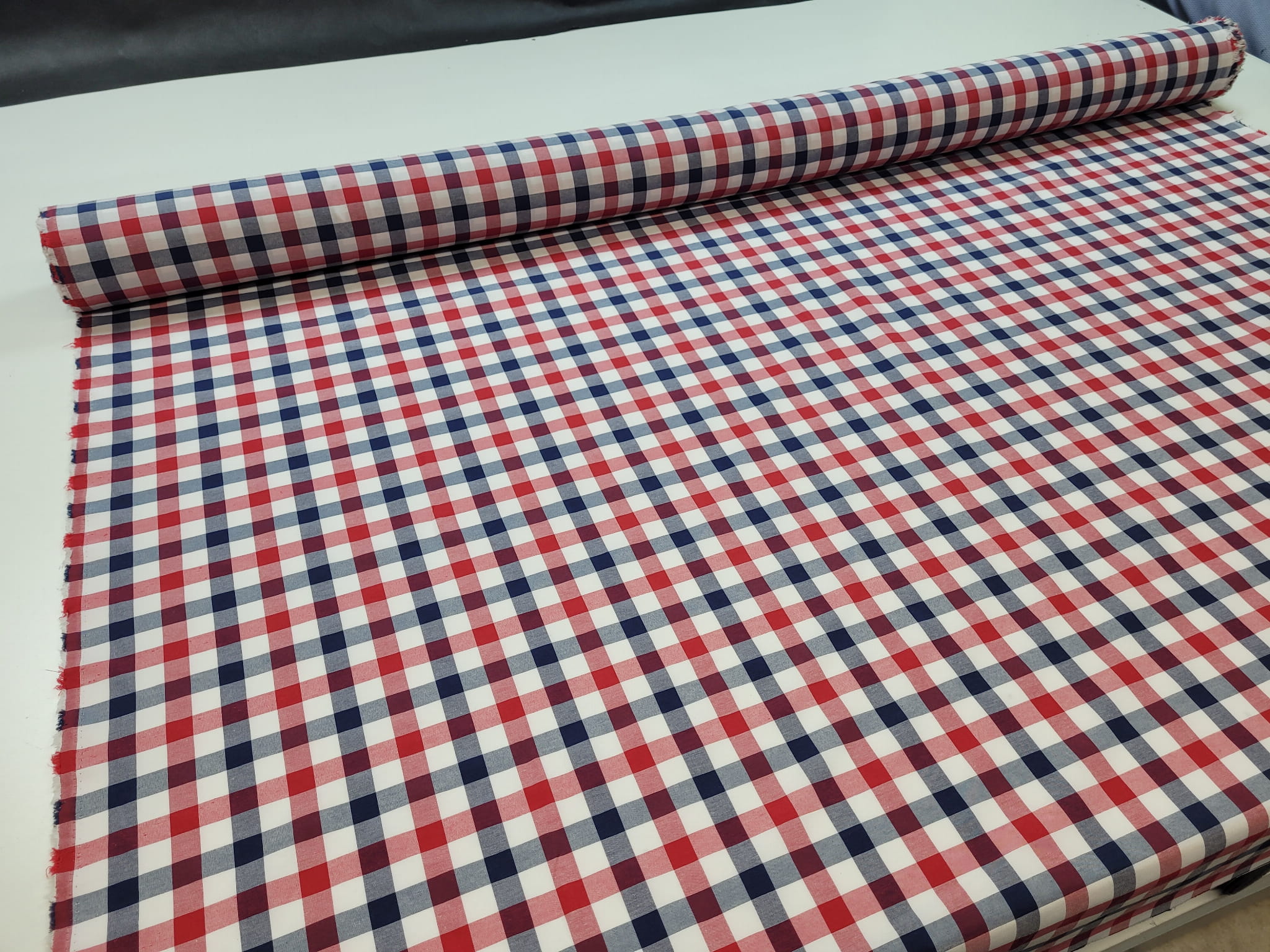 Bawełna koszulowa we wzór kraty typu vichy. Skład 65% bawełna 35% poliester. Kratka jest w kolorze biało-czerwono-granatowym. Przyjemna w dotyku, lekko pracuje po szerokości, mało się gniecie.