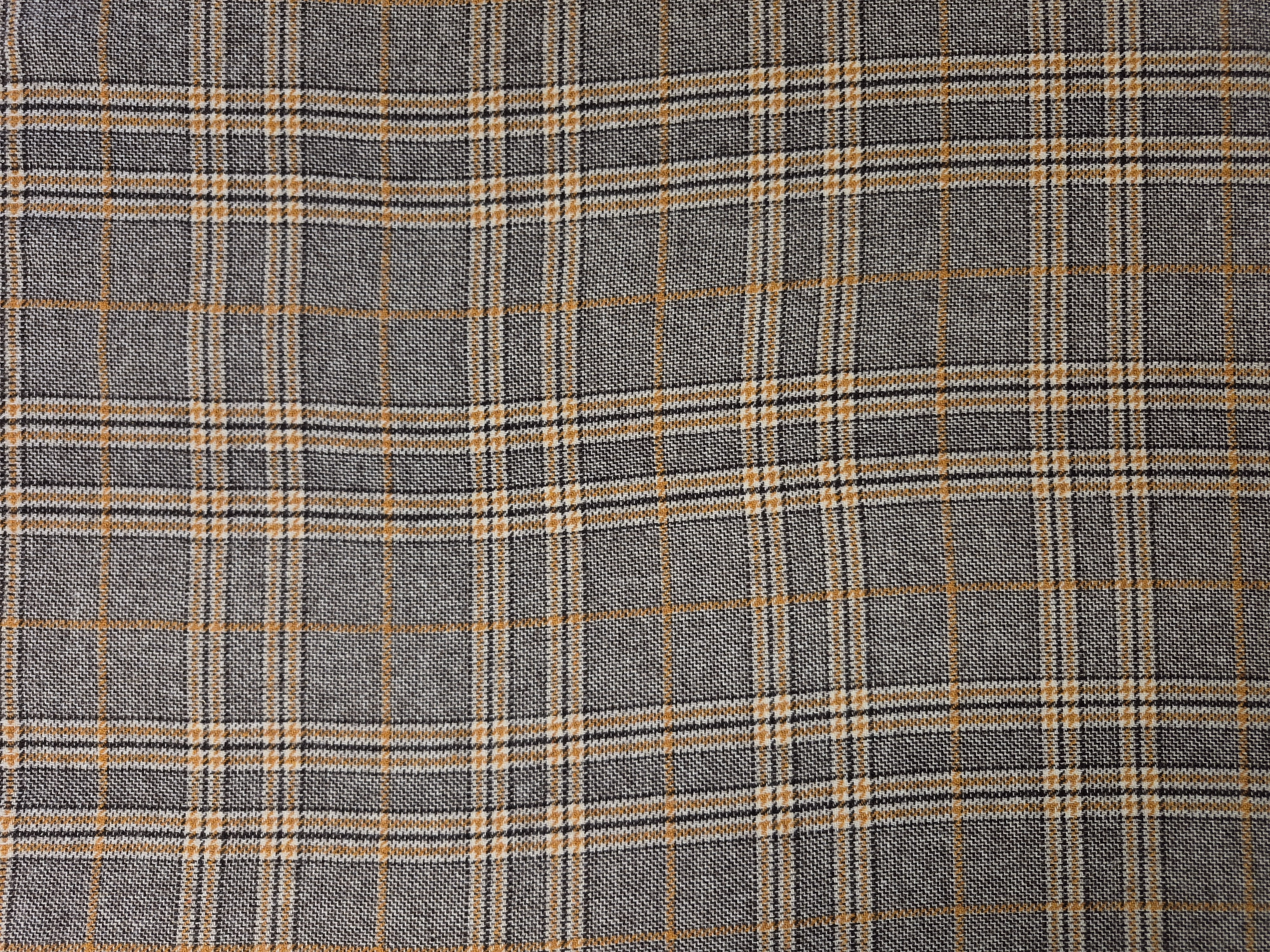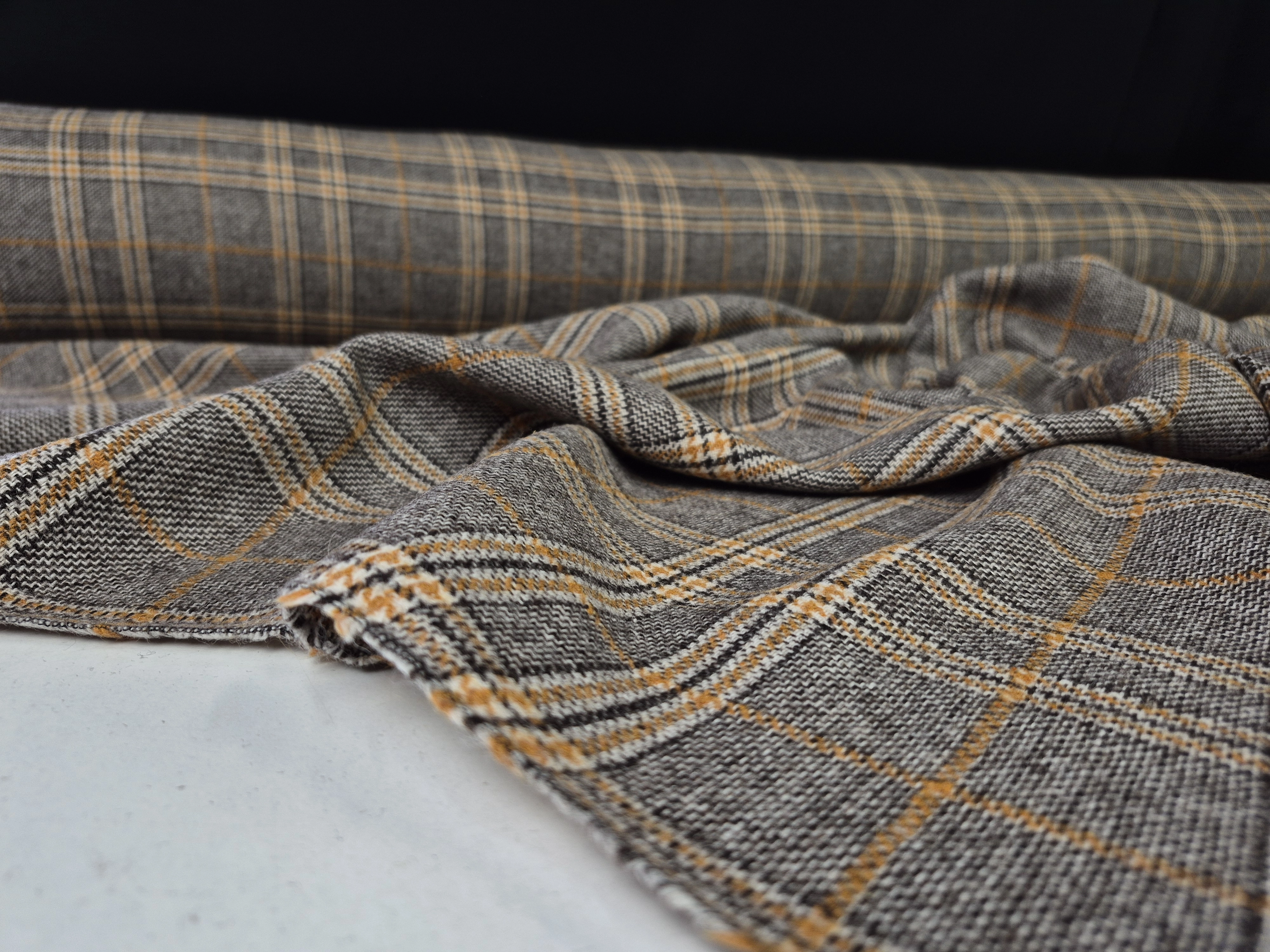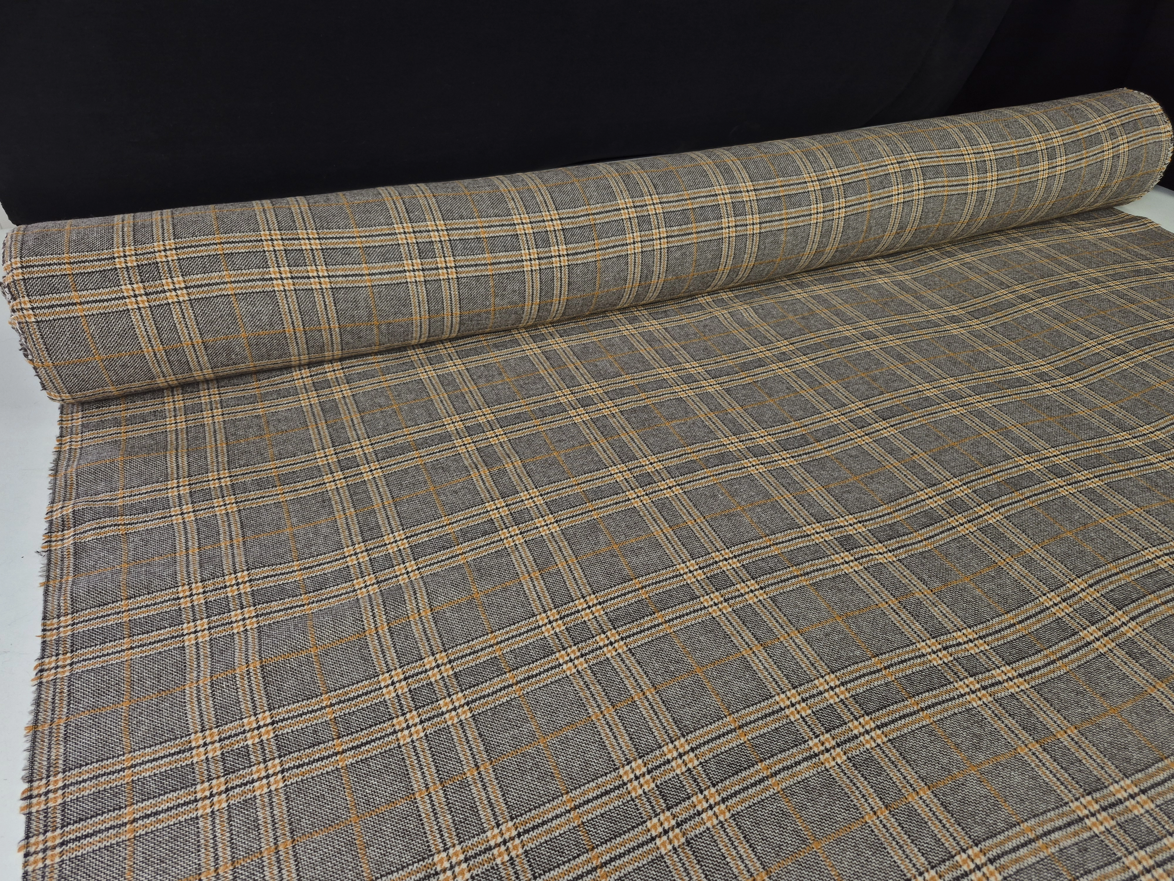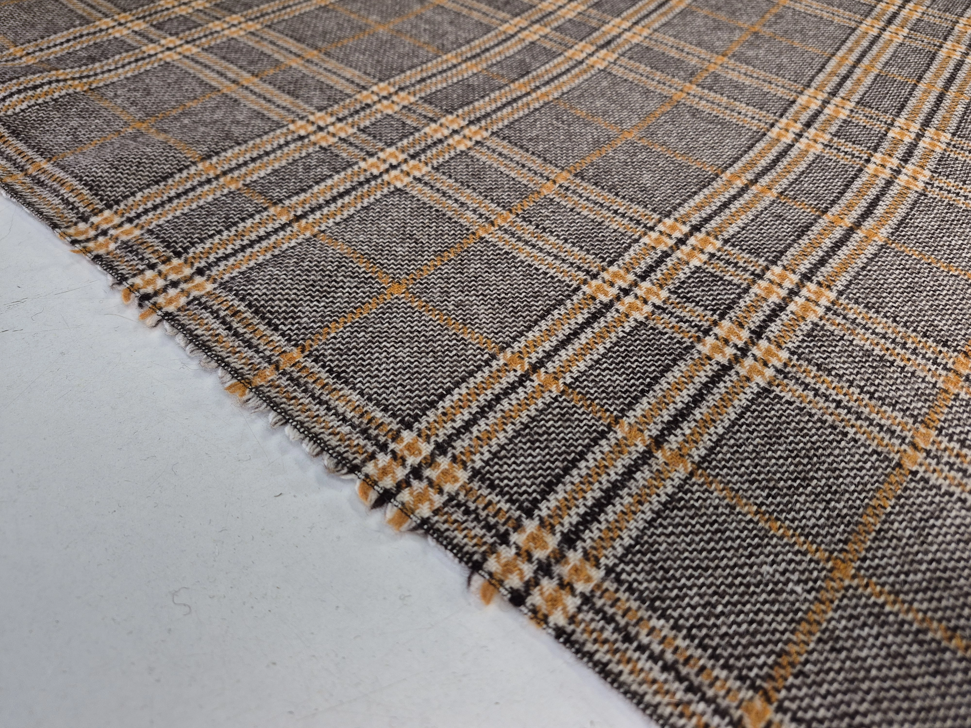 Wełna marynarkowa w kratę - dominuje kolor pomarańczowy, przy czym brązowa nić w połączeniu tych kolorów wydaje się czarna.